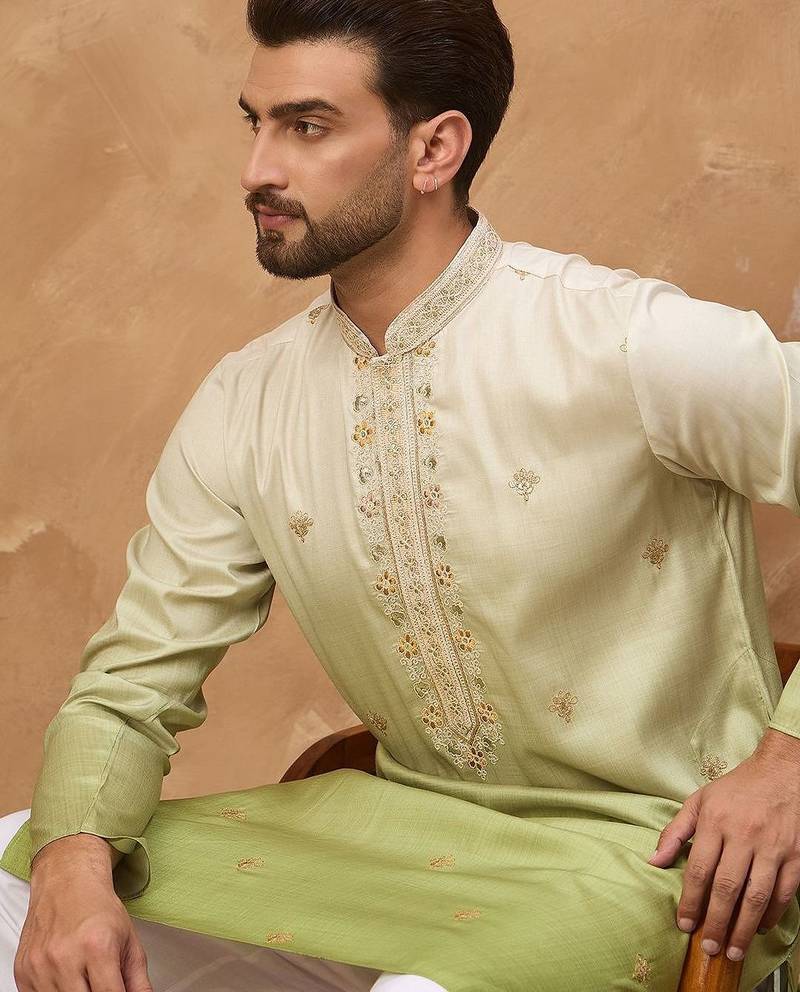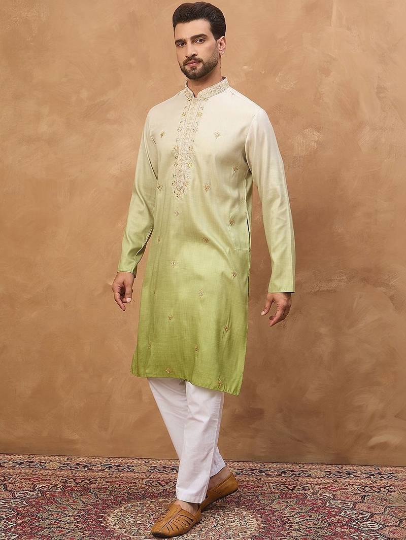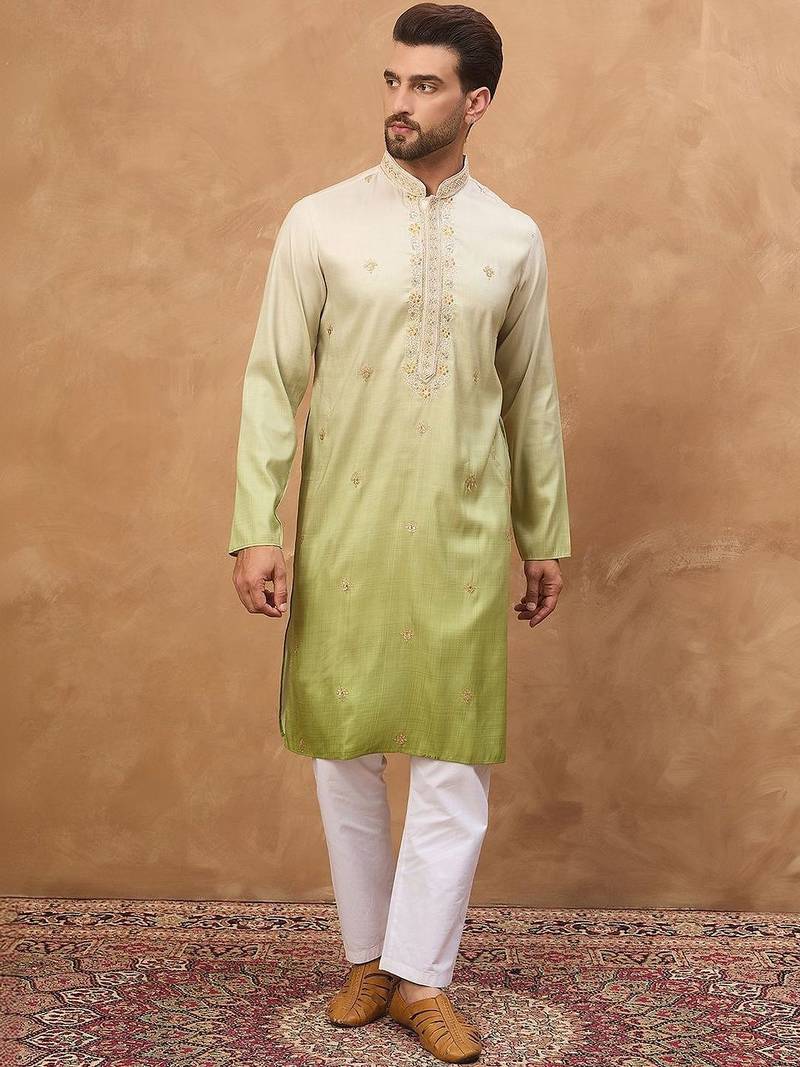 | Product Name | Men Green Silk Blend Solid Embroidered Straight Kurta With Pant Set | |