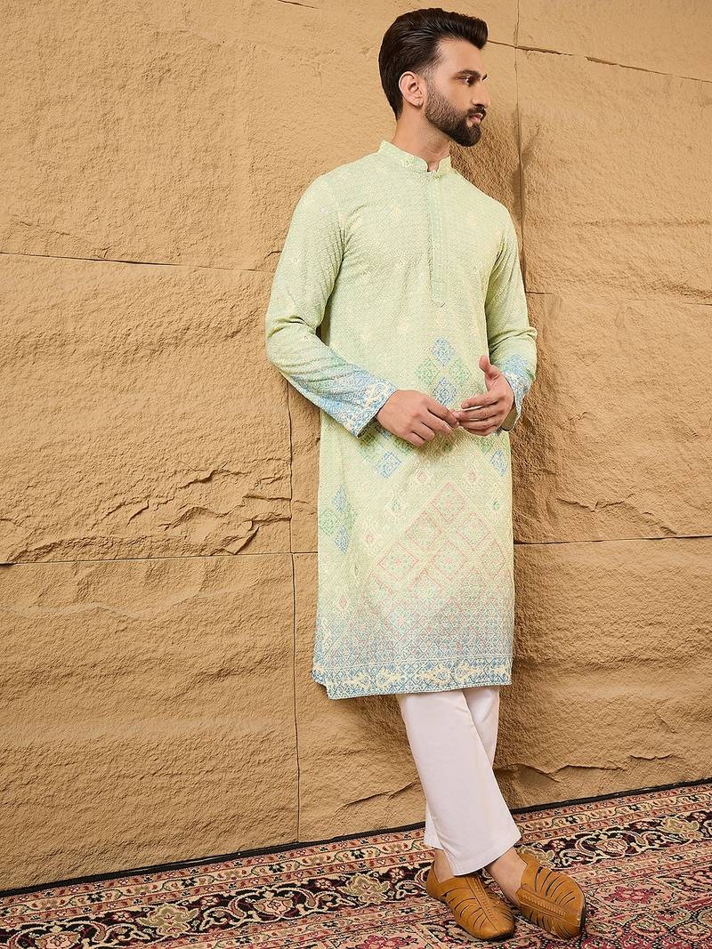 | Product Name | Men Green Viscose Rayon Bandhani Embroidered Straight Kurta With Trouser | |