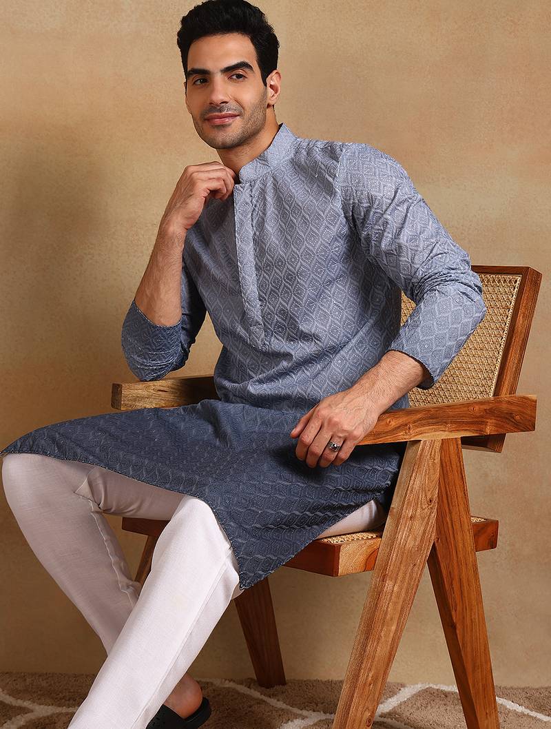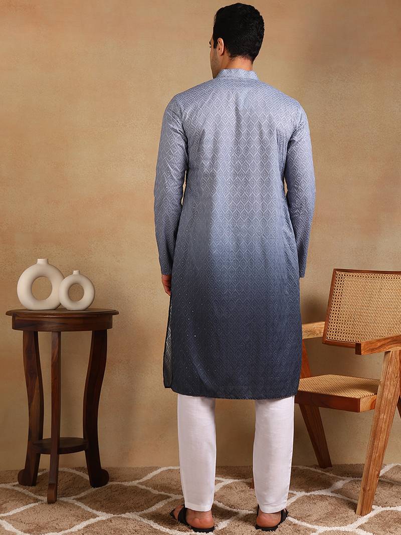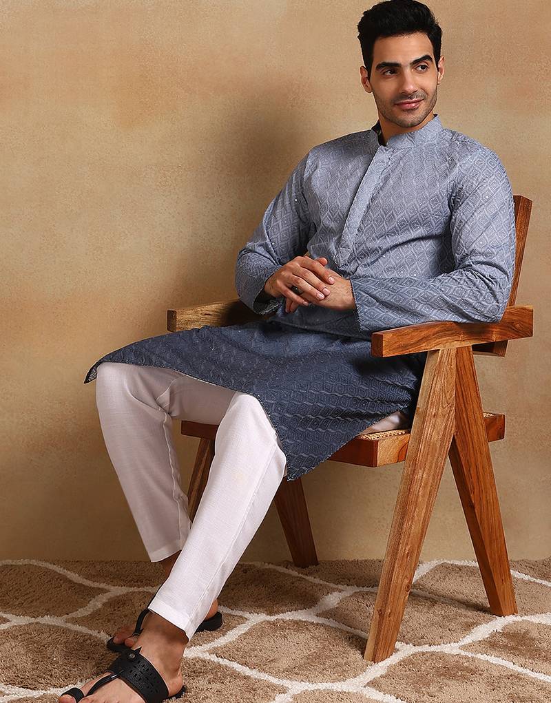 Men grey viscose rayon ethnic motifs embroidered straight kurta