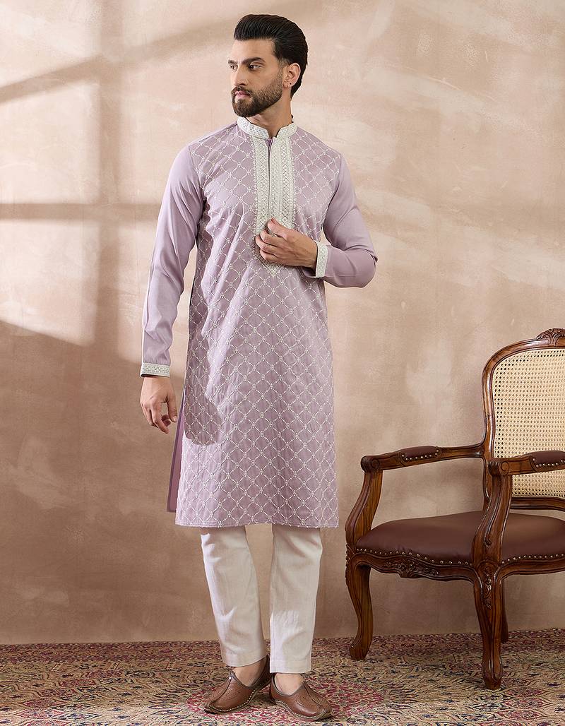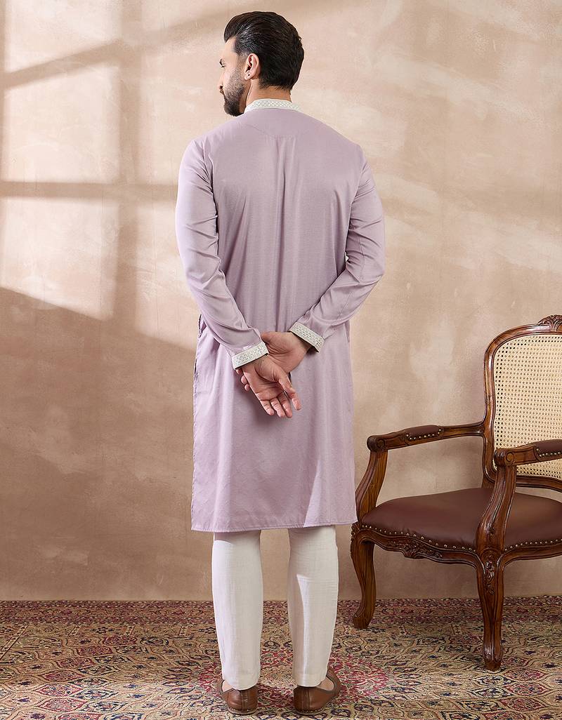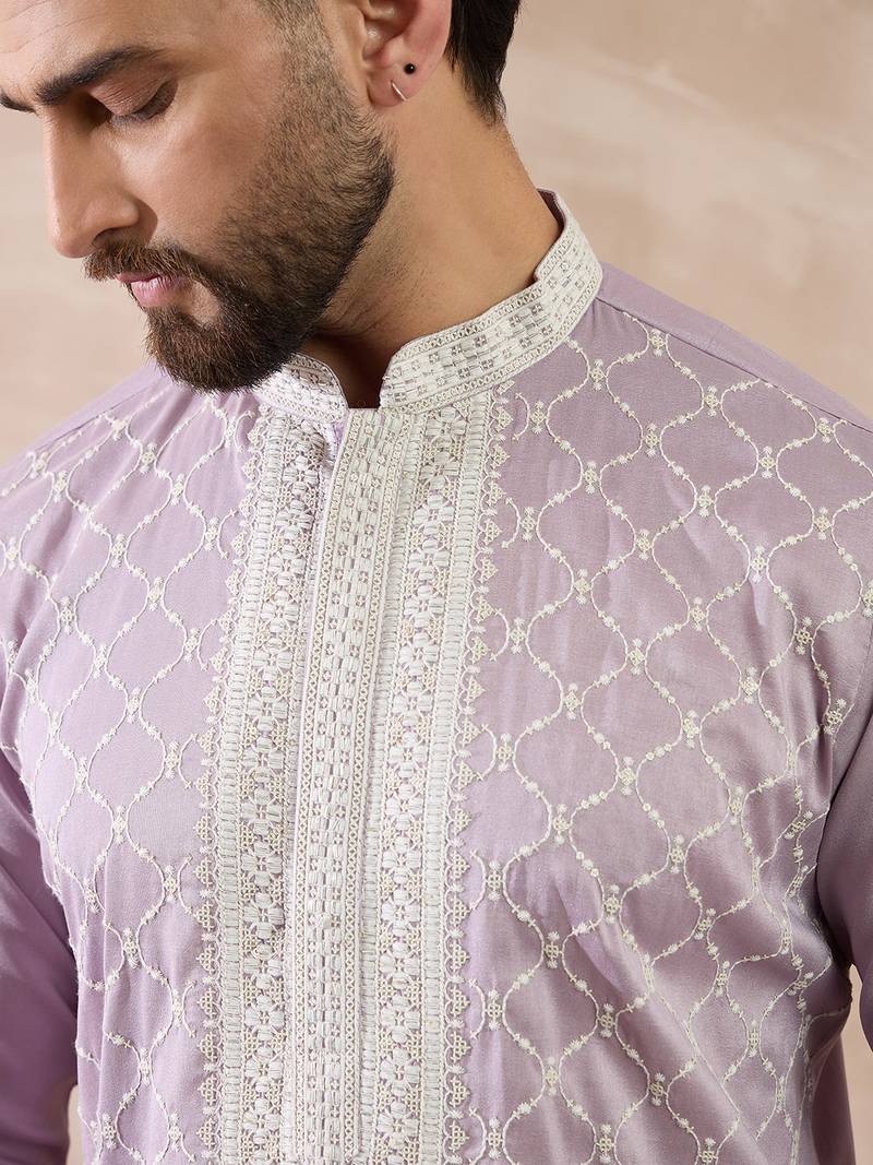 Men lavender silk blend embroidered mandarin collar straight kurta