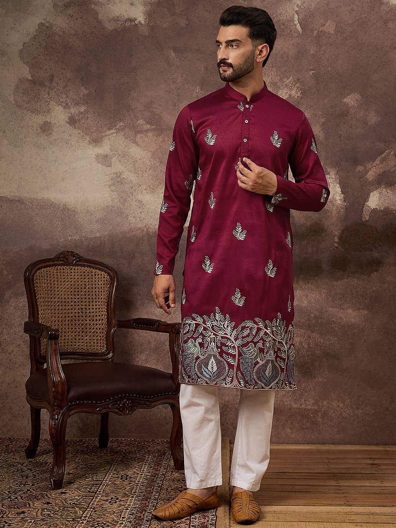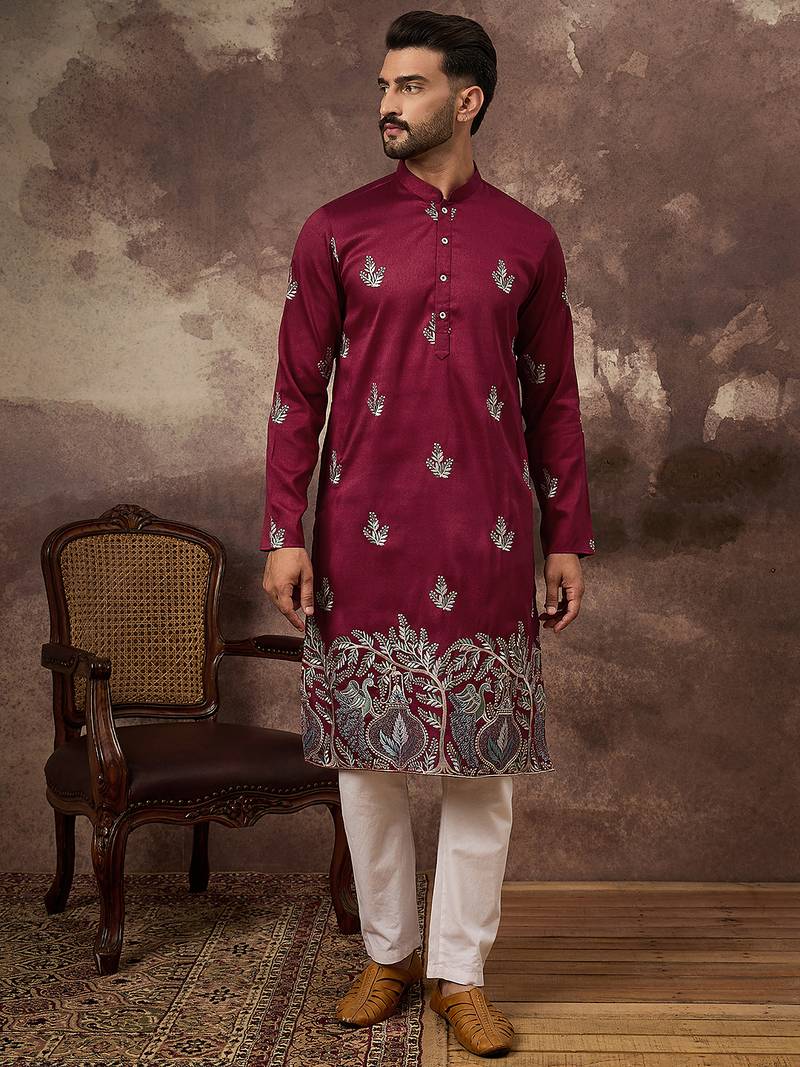Men maroon silk blend solid embroidered straight kurta