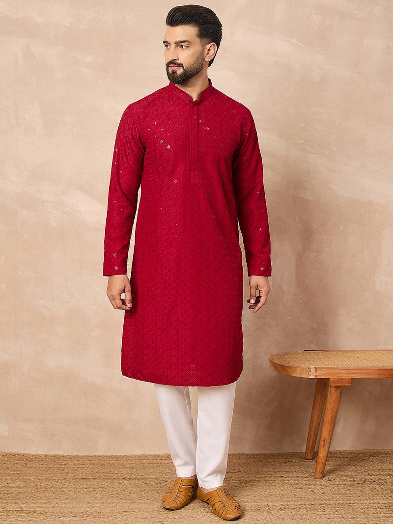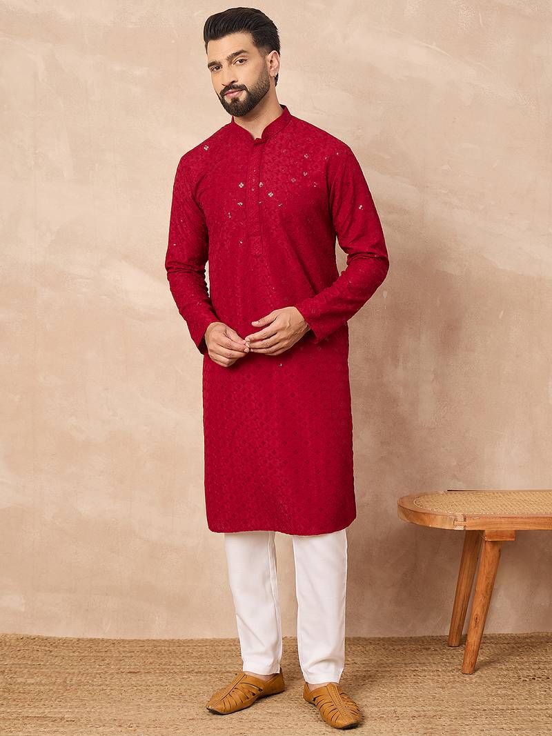 Men maroon viscose rayon solid embroidered straight kurta
