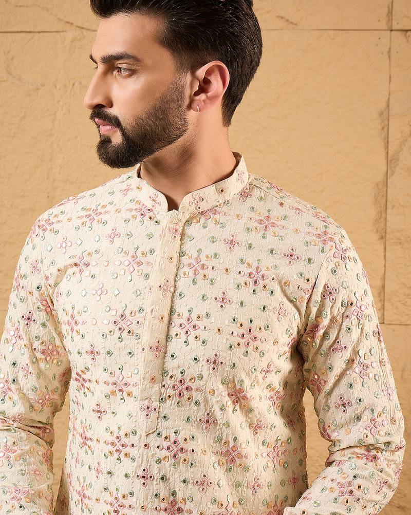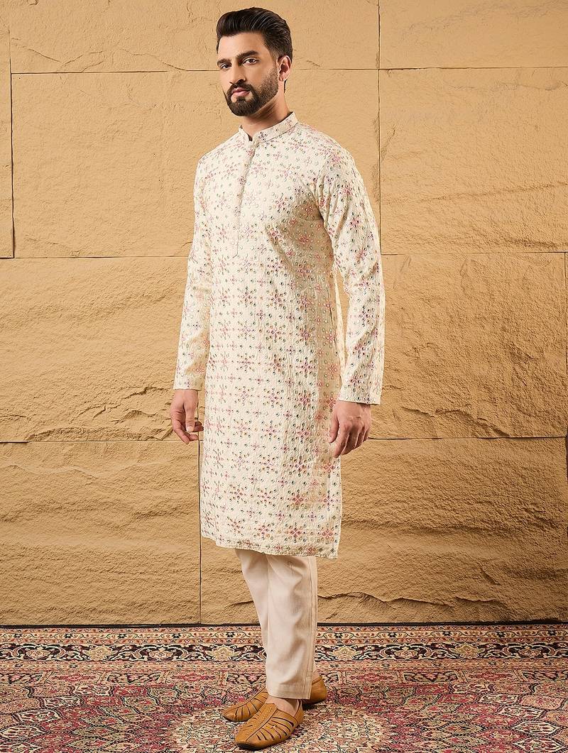 | Product Name | Men Off White Silk Blend Solid Embroidered Straight Kurta | |