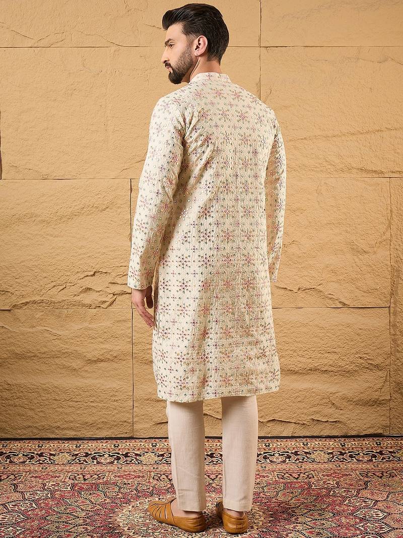 Men off white silk blend solid embroidered straight kurta
