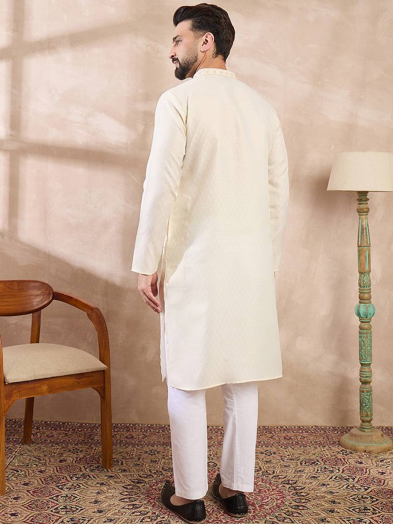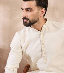 Men off white silk blend solid woven design straight kurta