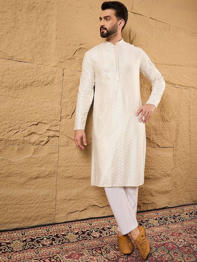 | Product Name | Men Off White Viscose Rayon Solid Embroidered Straight Kurta With Trousers | |