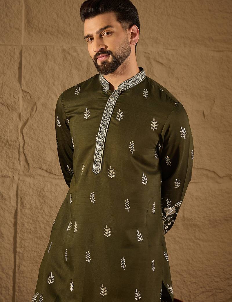| Product Name | Men Olive Vertican Solid Embroidered Straight Kurta | |
