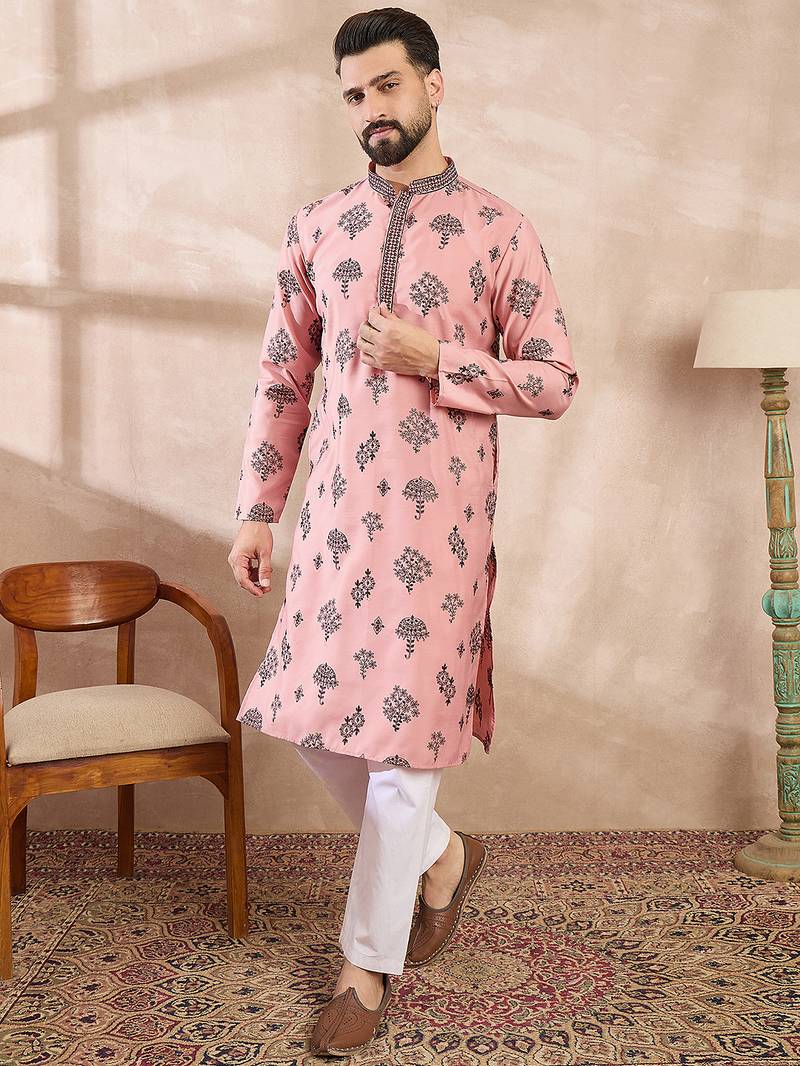 | Product Name | Men Peach Silk Blend Solid Embroidered Straight Kurta | |