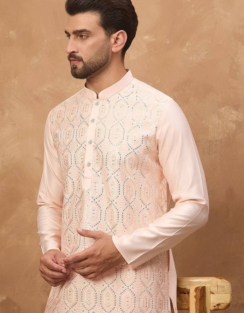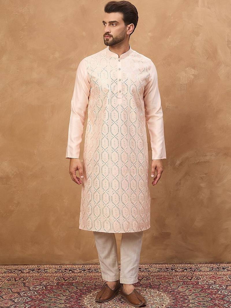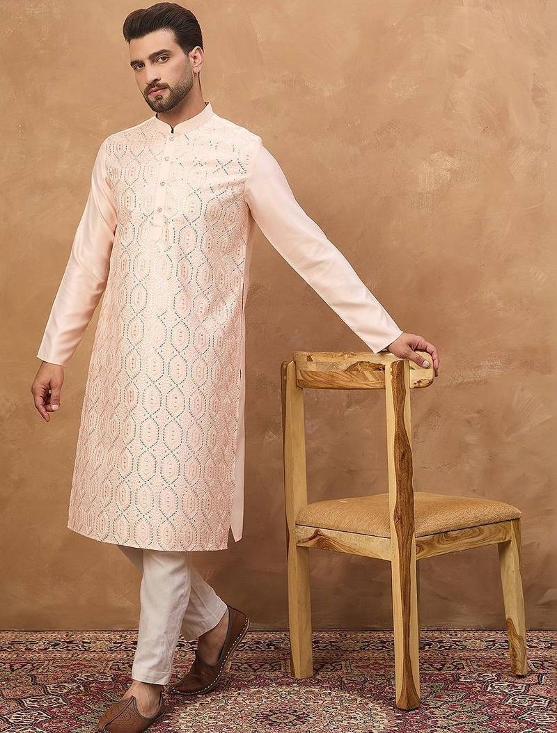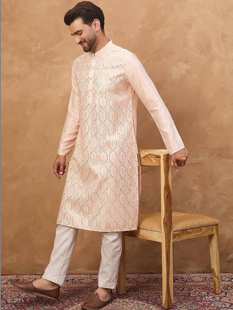 | Product Name | Men Peach Silk Blend Solid Embroidered Straight Kurta With Pant Set | |