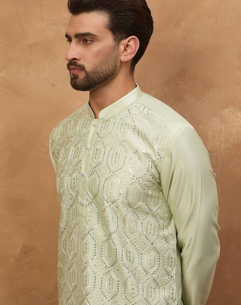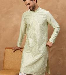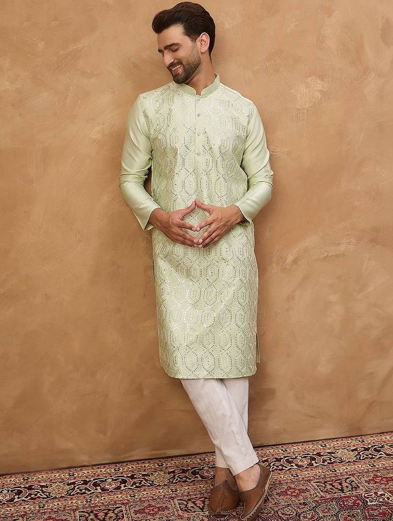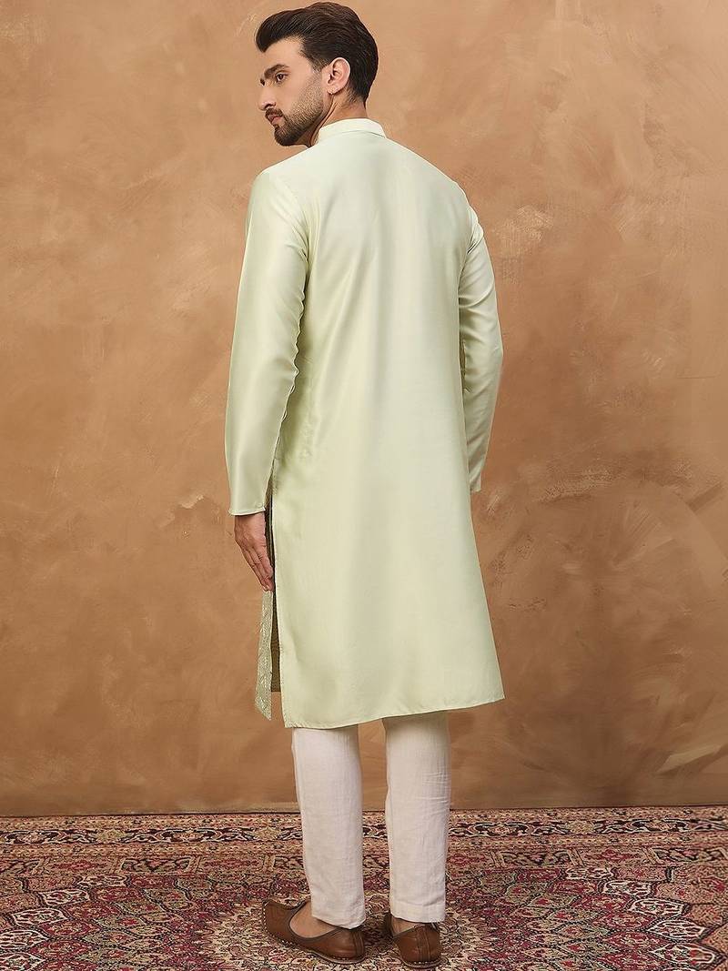 | Product Name | Men Peach Silk Blend Solid Embroidered Straight Kurta With Pant Set | |