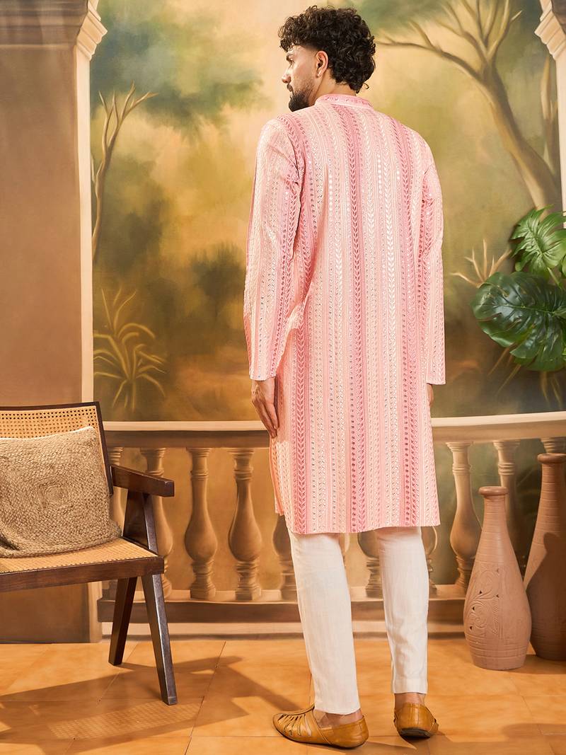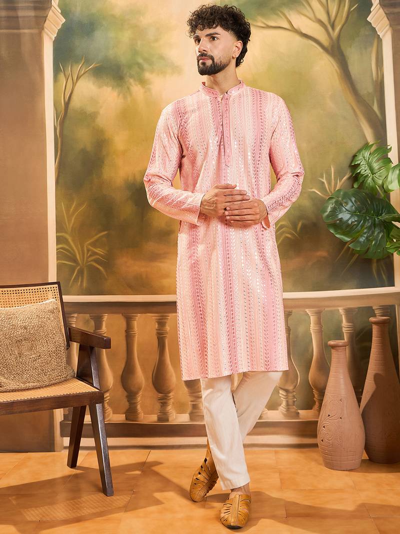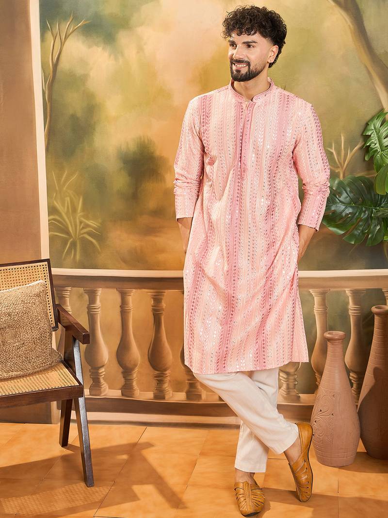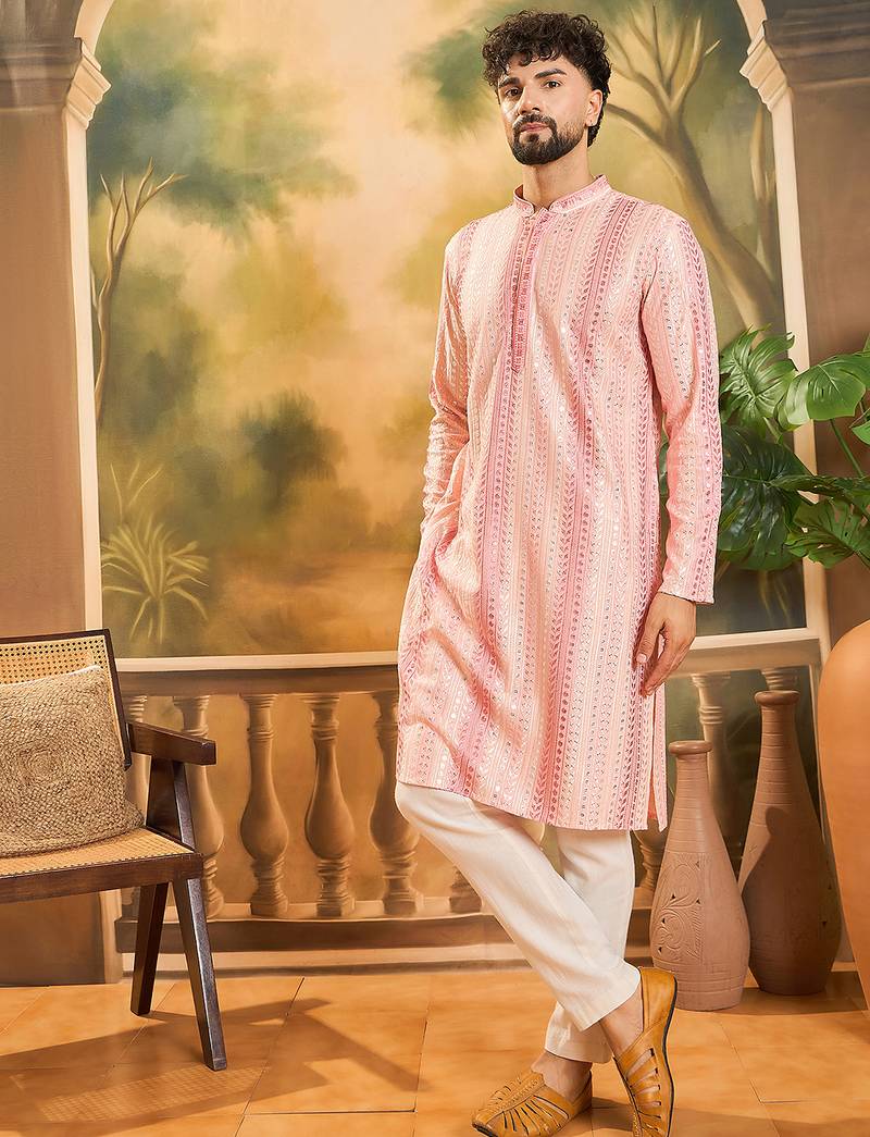 | Product Name | Men Peach Viscose Rayon Solid Embroidered Straight Kurta | |