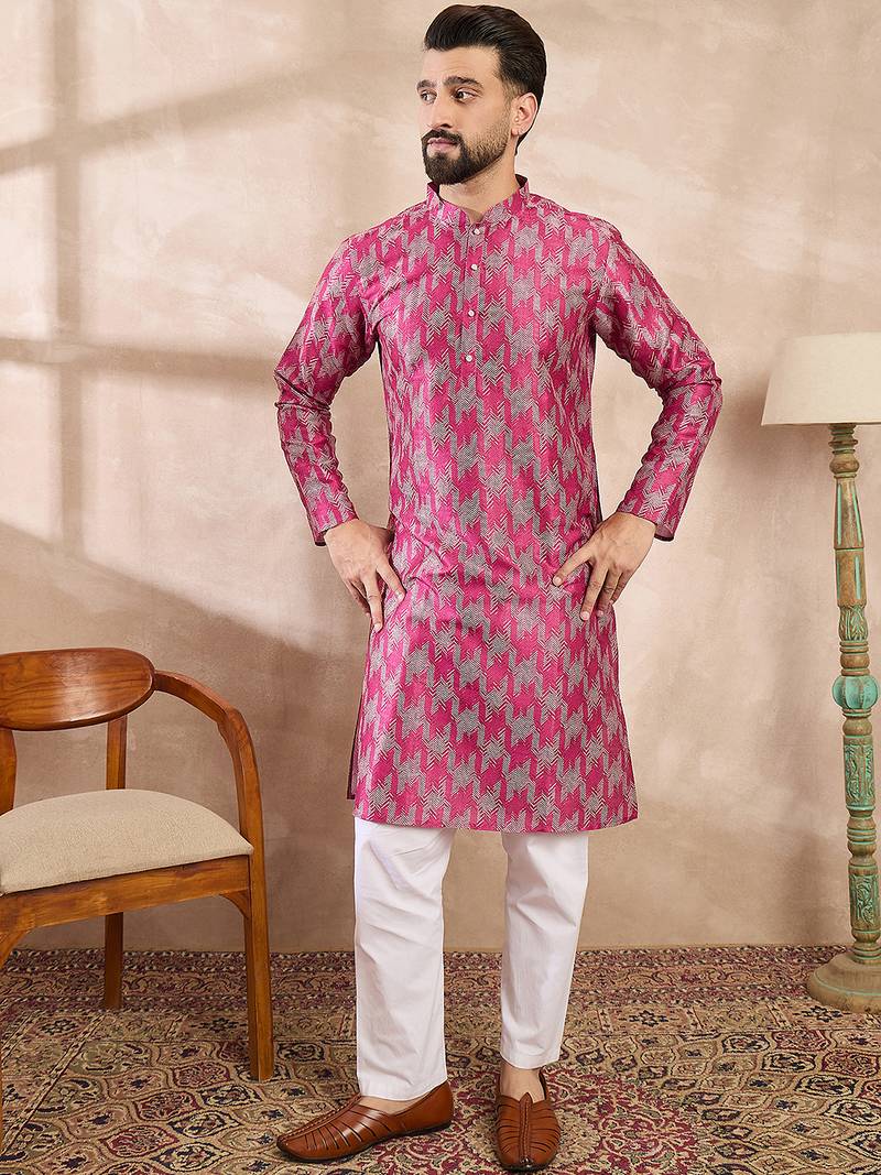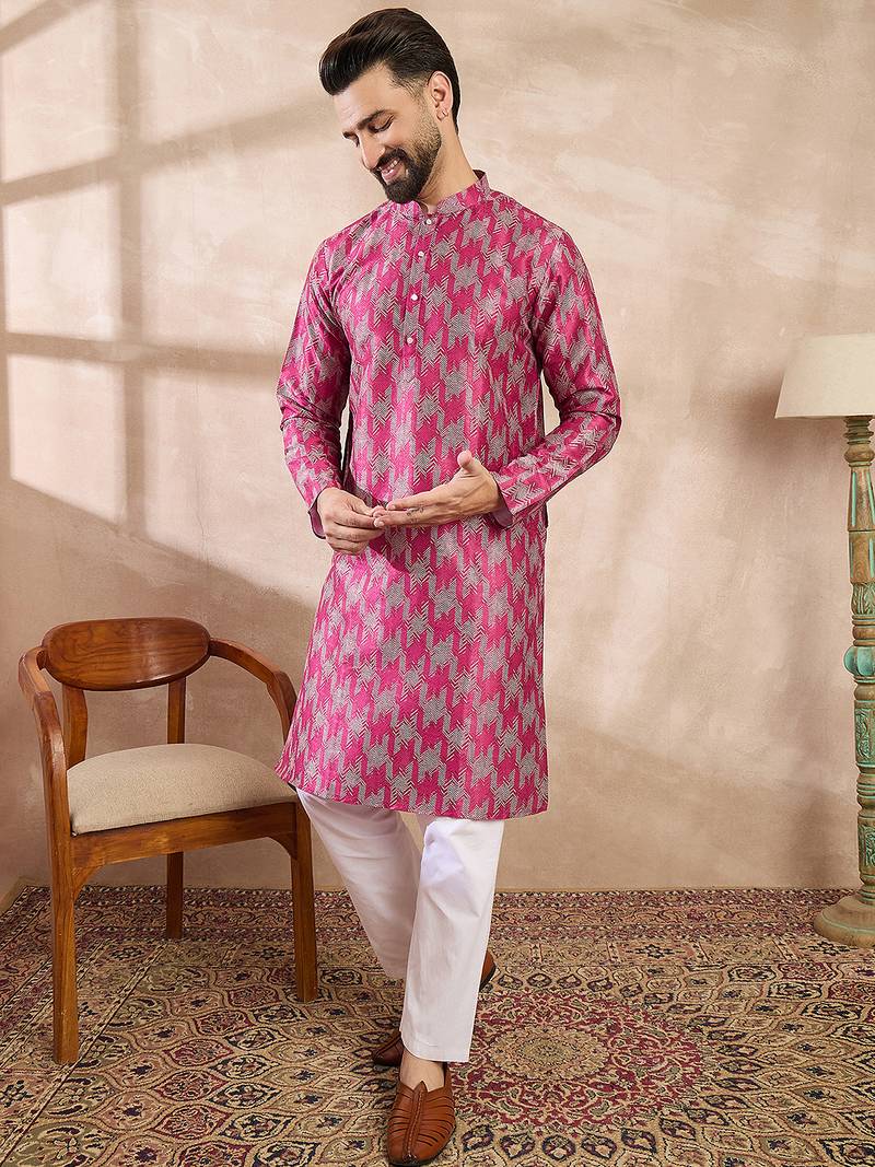 Product Name Men Pink Silk Blend Abstract Printed Straight Kurta With Trouser