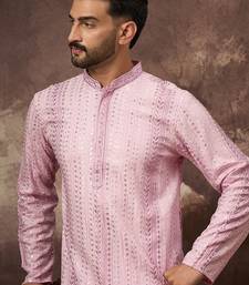 Men pink viscose rayon embroidered straight kurta