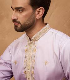 Men purple silk blend solid embroidered straight kurta