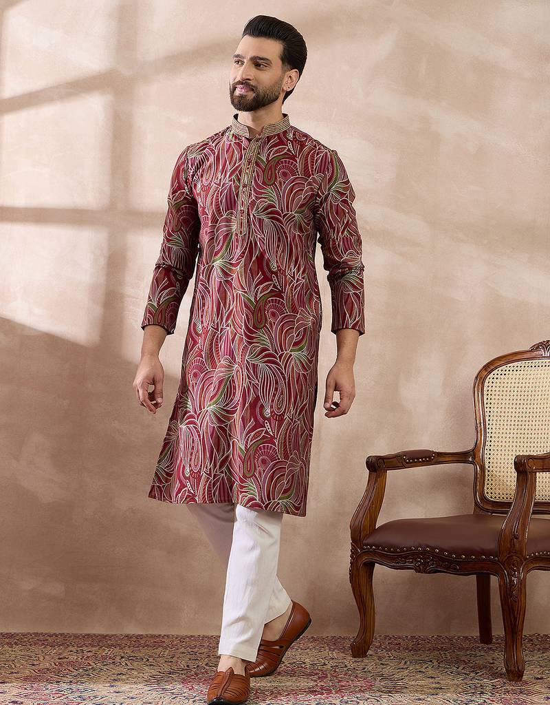 | Product Name | Men Red Silk Blend Printed Mandarin Collar Straight Kurta With Trouser | |