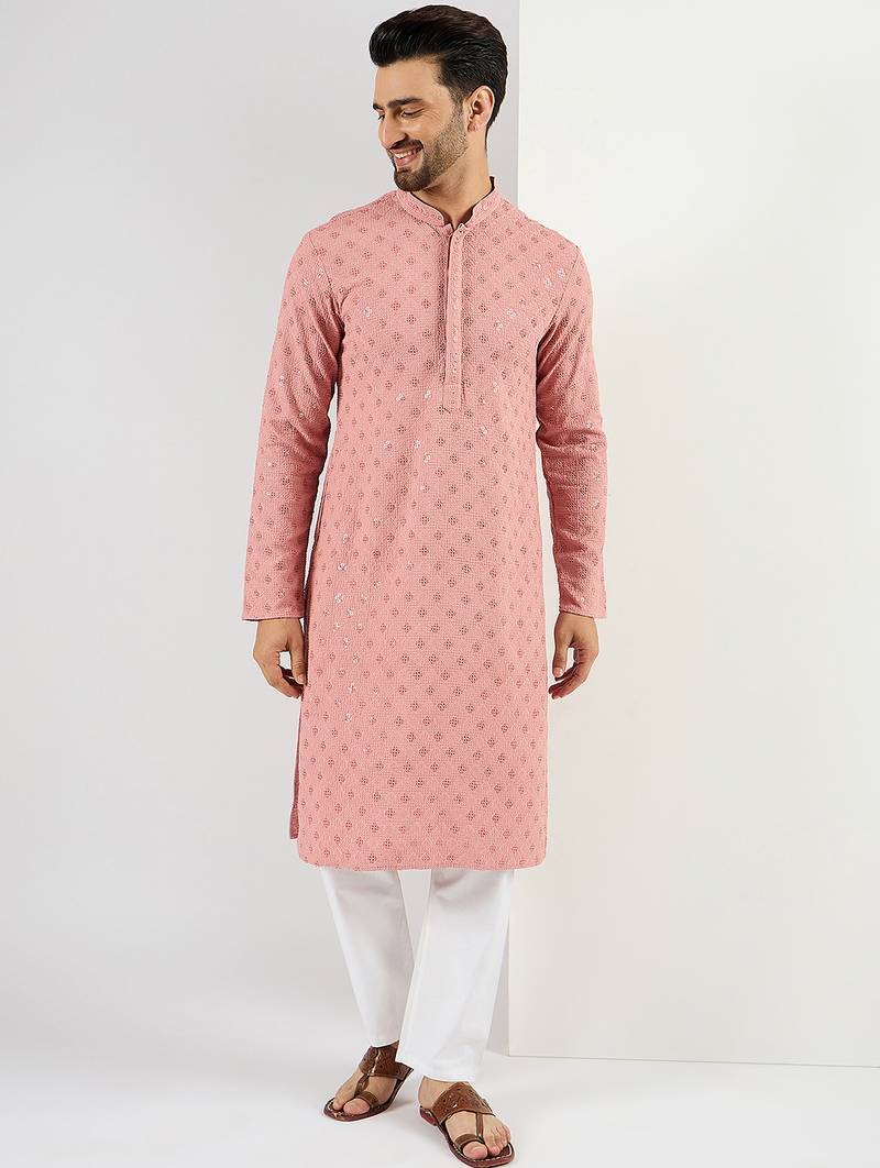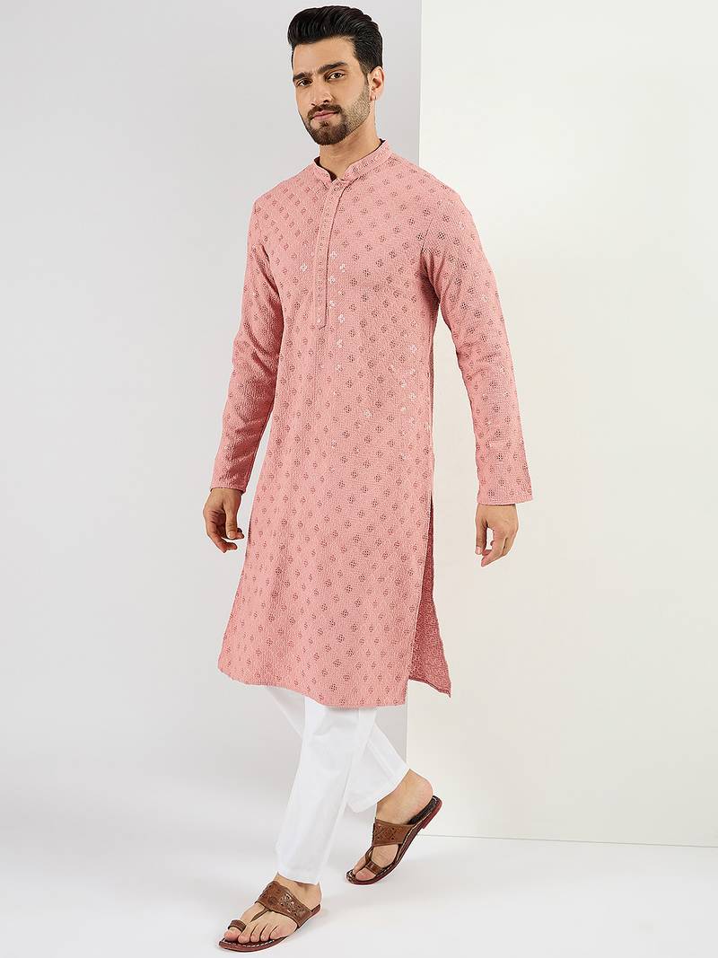 Men's pink viscose rayon embroidered straight sequins kurta
