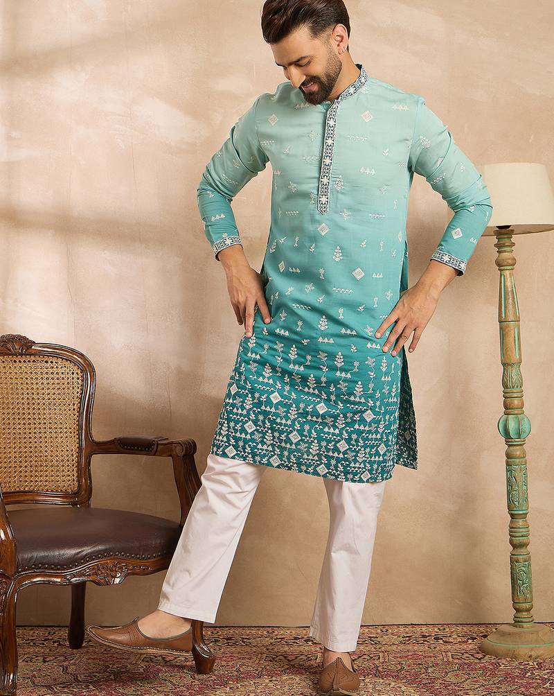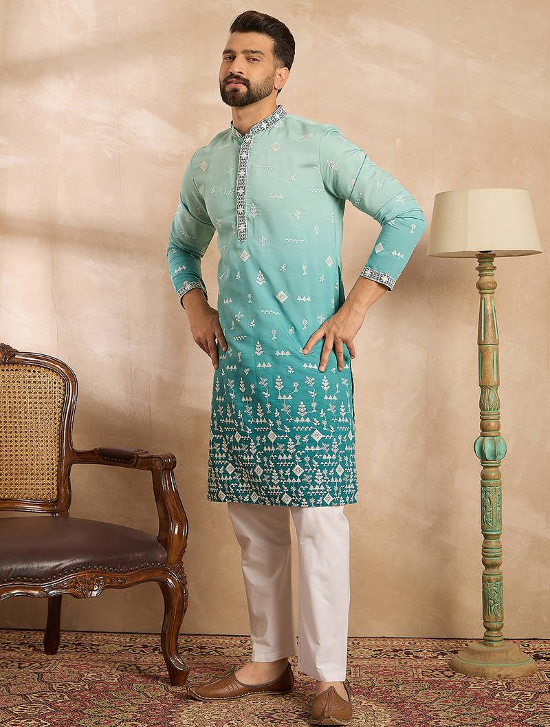 | Product Name | Men Teal Silk Blend Ombre Embroidered Straight Kurta | |