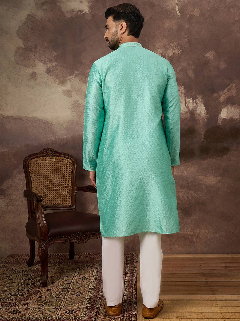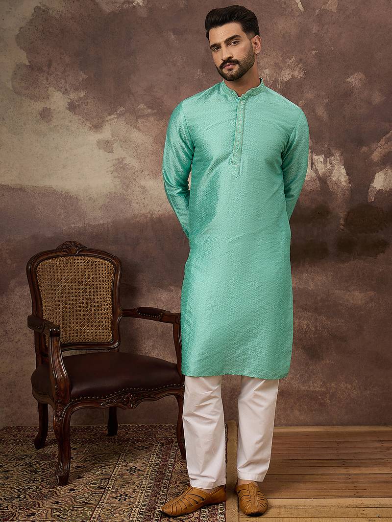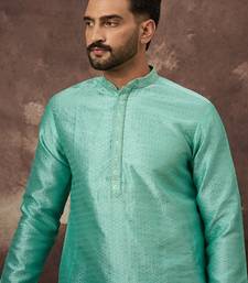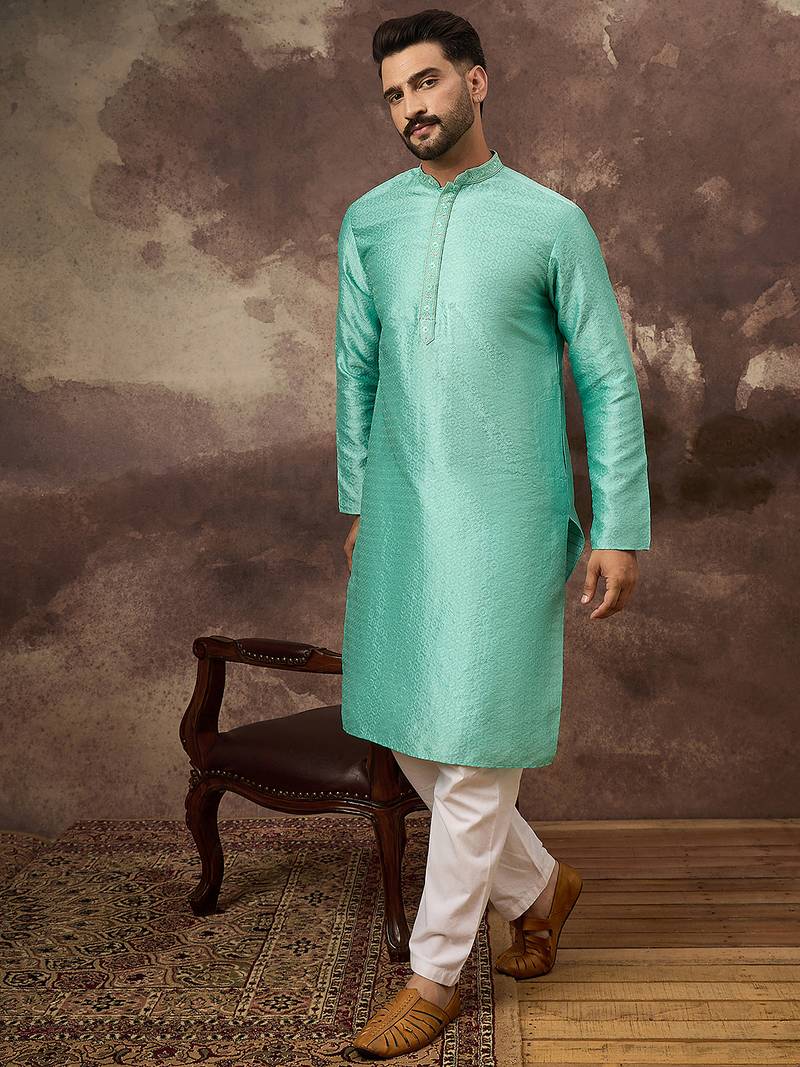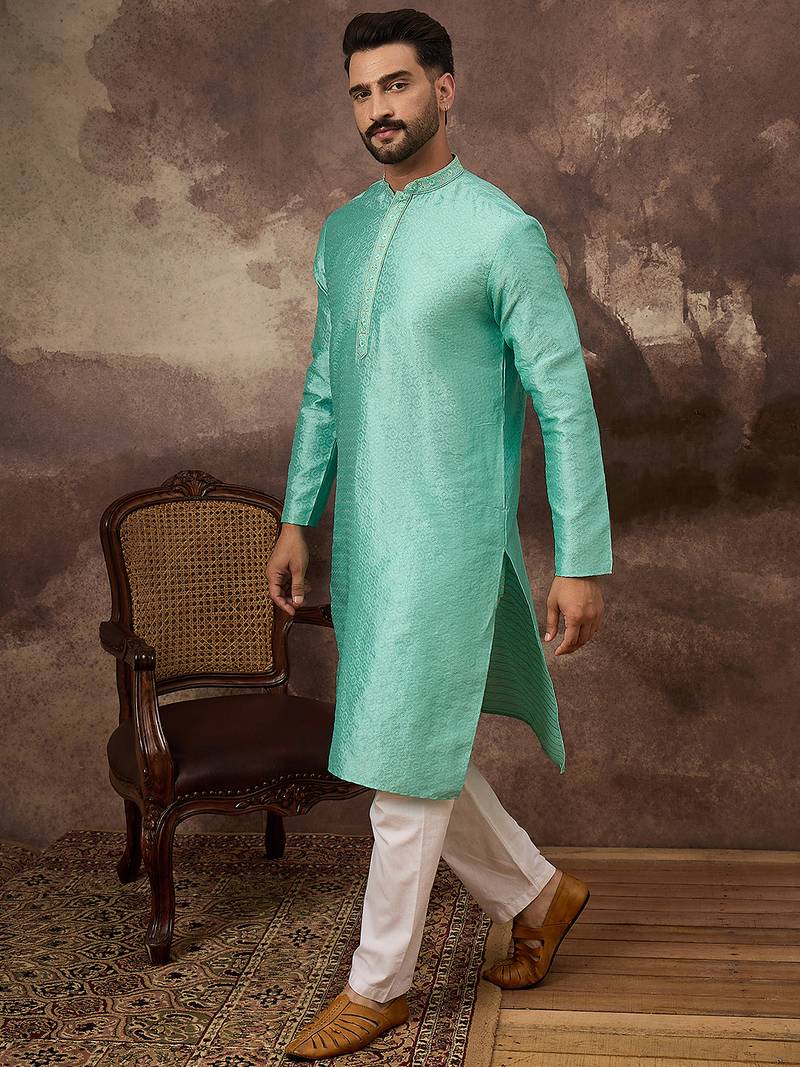 | Product Name | Men Turquoise Blue Silk Blend Solid Woven Design Straight Kurta | |