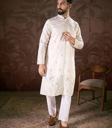 Men white silk blend floral embroidered straight kurta with trouser
