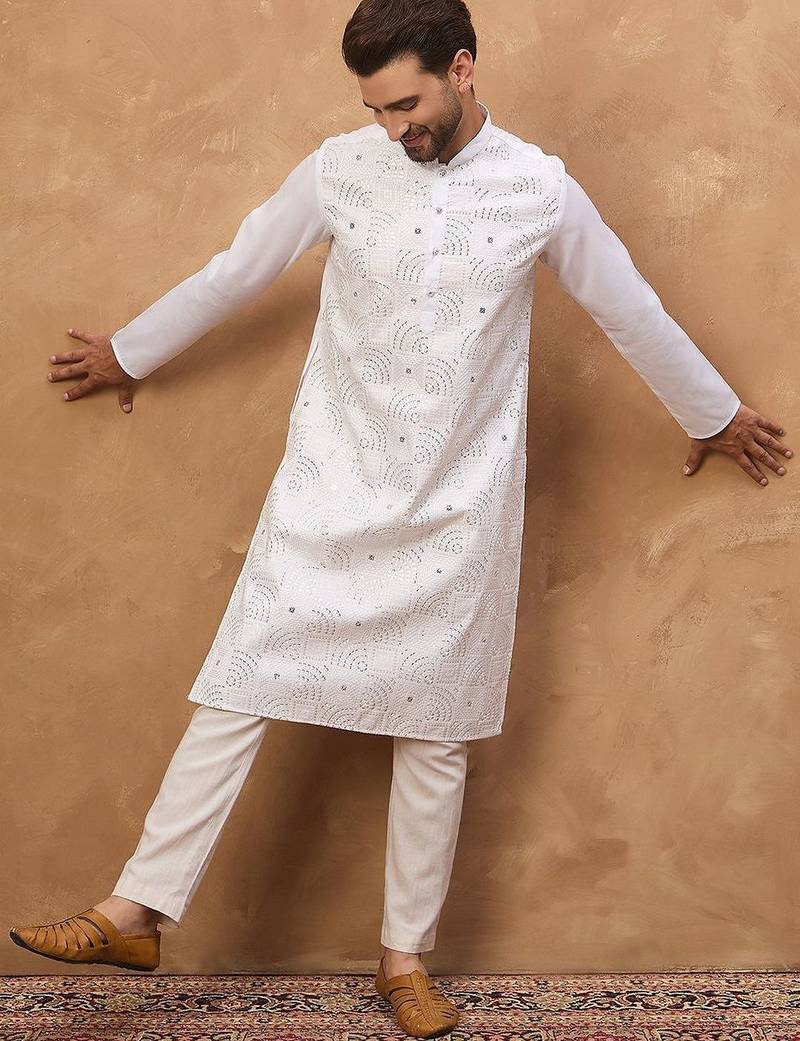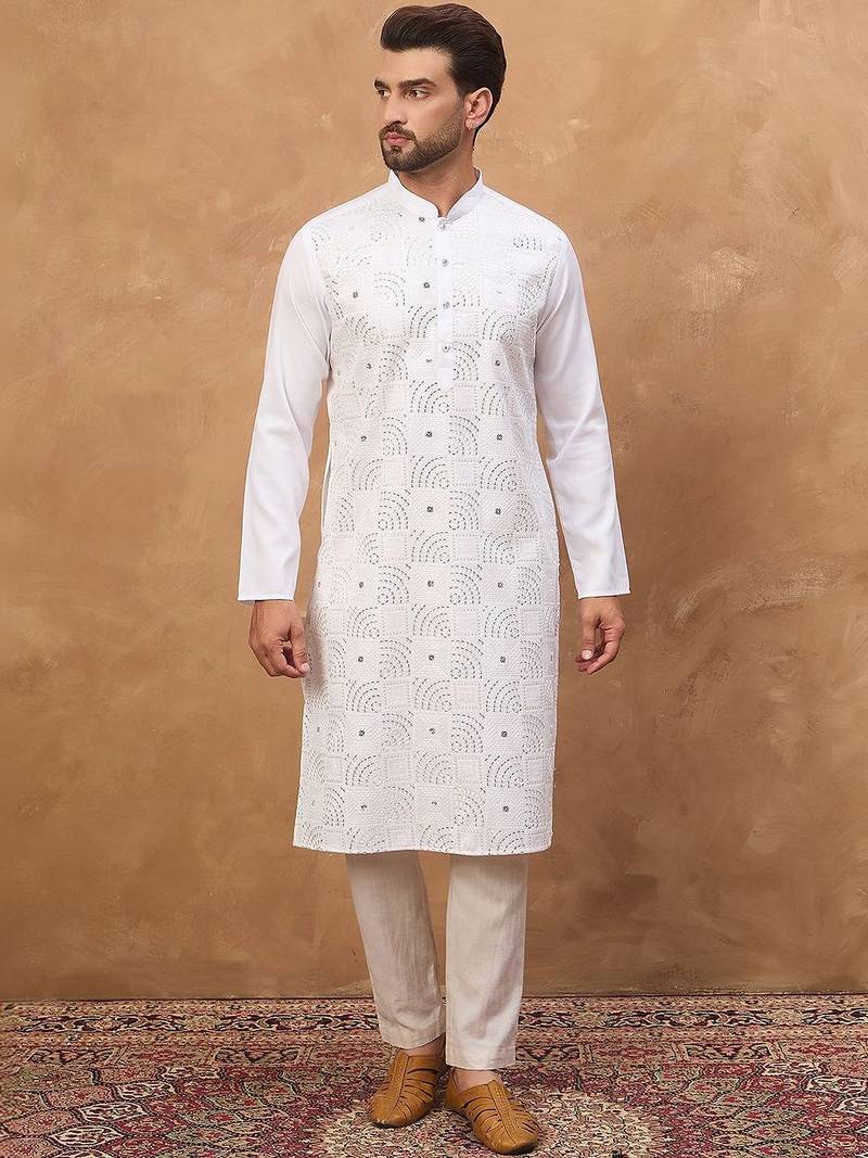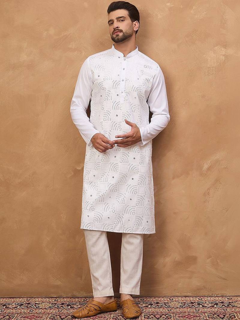 | Product Name | Men White Silk Blend Solid Embroidered Straight Kurta With Pant Set | |