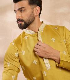 Men yellow polyester solid embroidered straight kurta sets