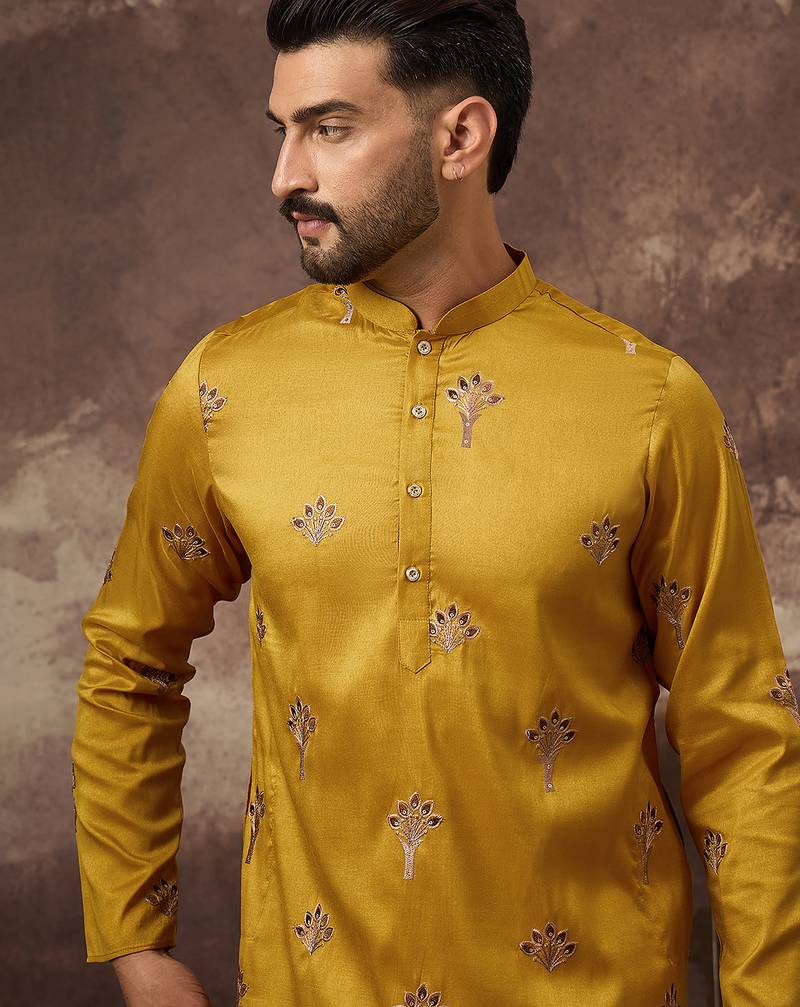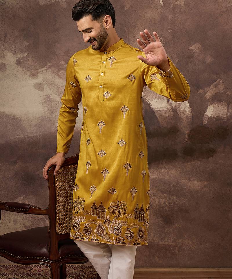 Men yellow silk blend solid embroidered straight kurta and trouser