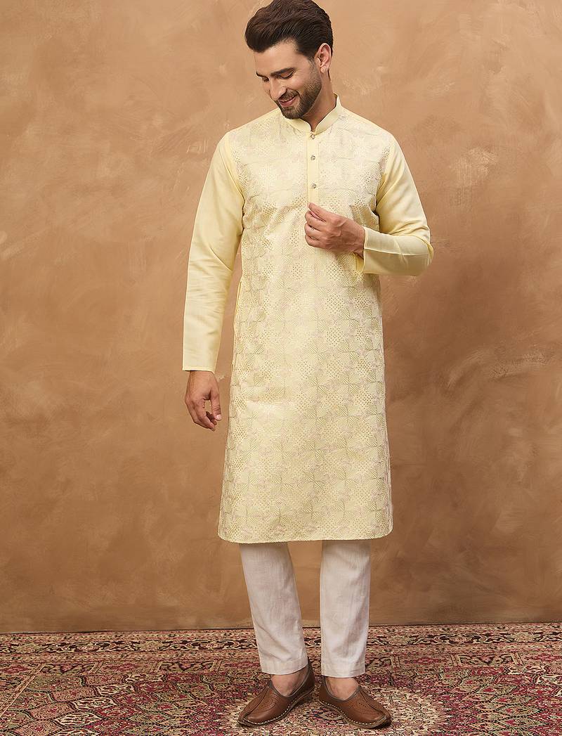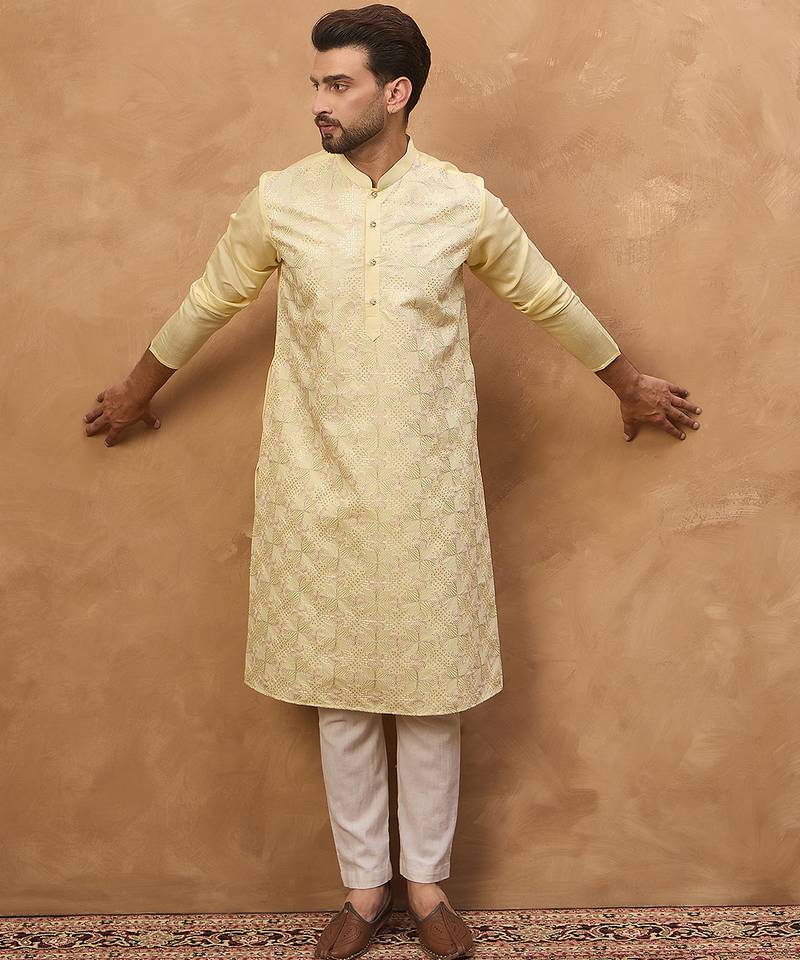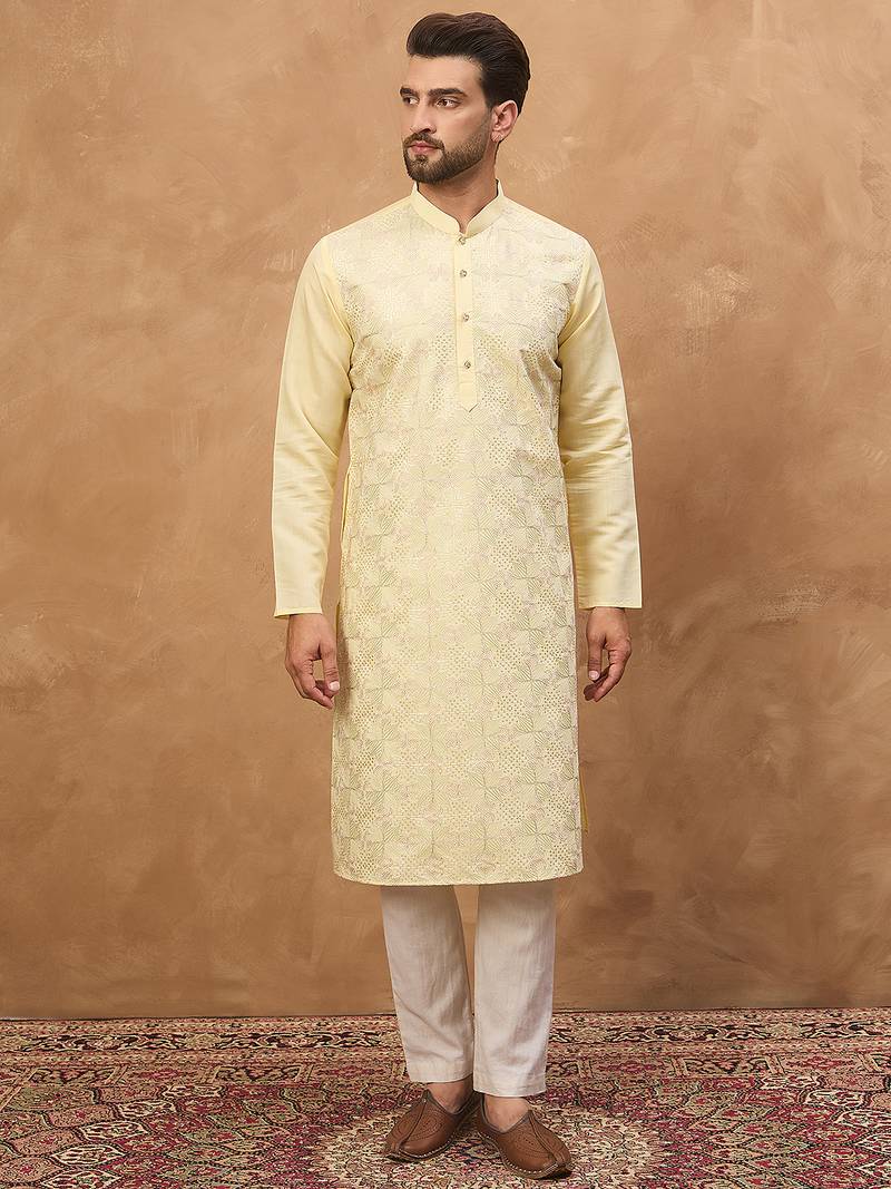 | Product Name | Men Yellow Silk Blend Solid Embroidered Straight Kurta | |