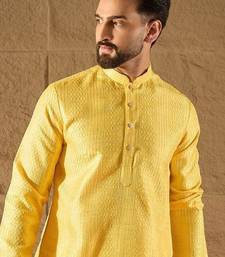 Men yellow silk blend solid embroidered straight kurta