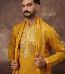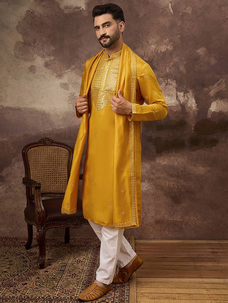 | Product Name | Men Yellow Silk Blend Solid Embroidered Straight Kurta With Dupatta | |
