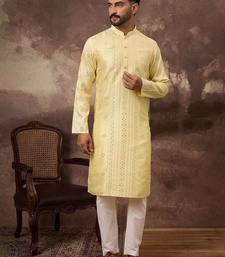 Men yellow silk blend solid embroidered straight kurta with pant set