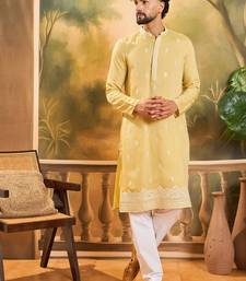 | Product Name | Men Yellow Silk Blend Solid Embroidered Straight Kurta With Trouser | |