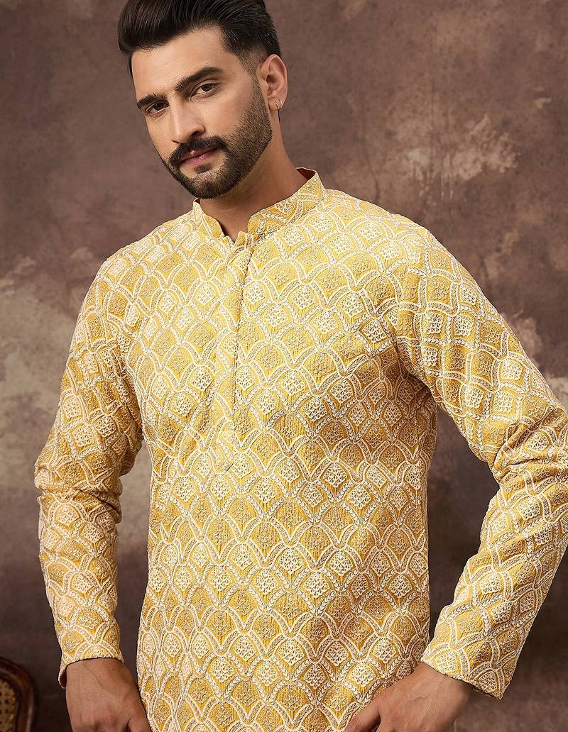 | Product Name | Men Yellow Viscose Rayon Solid Embroidered Straight Kurta With Trouser | |