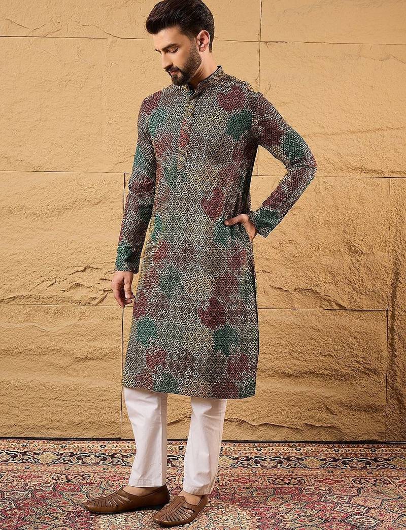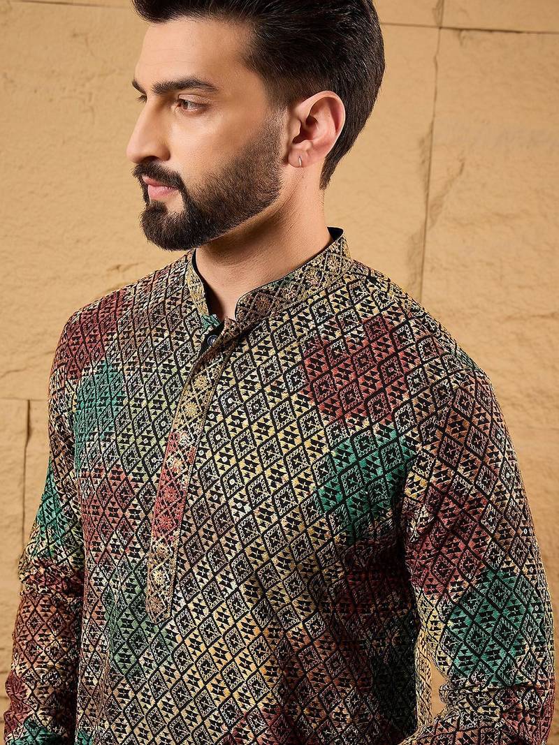 Product Name Mens Multi Viscose Rayon Geometric Embroidered Chikankari Straight Kurta With Pant Set