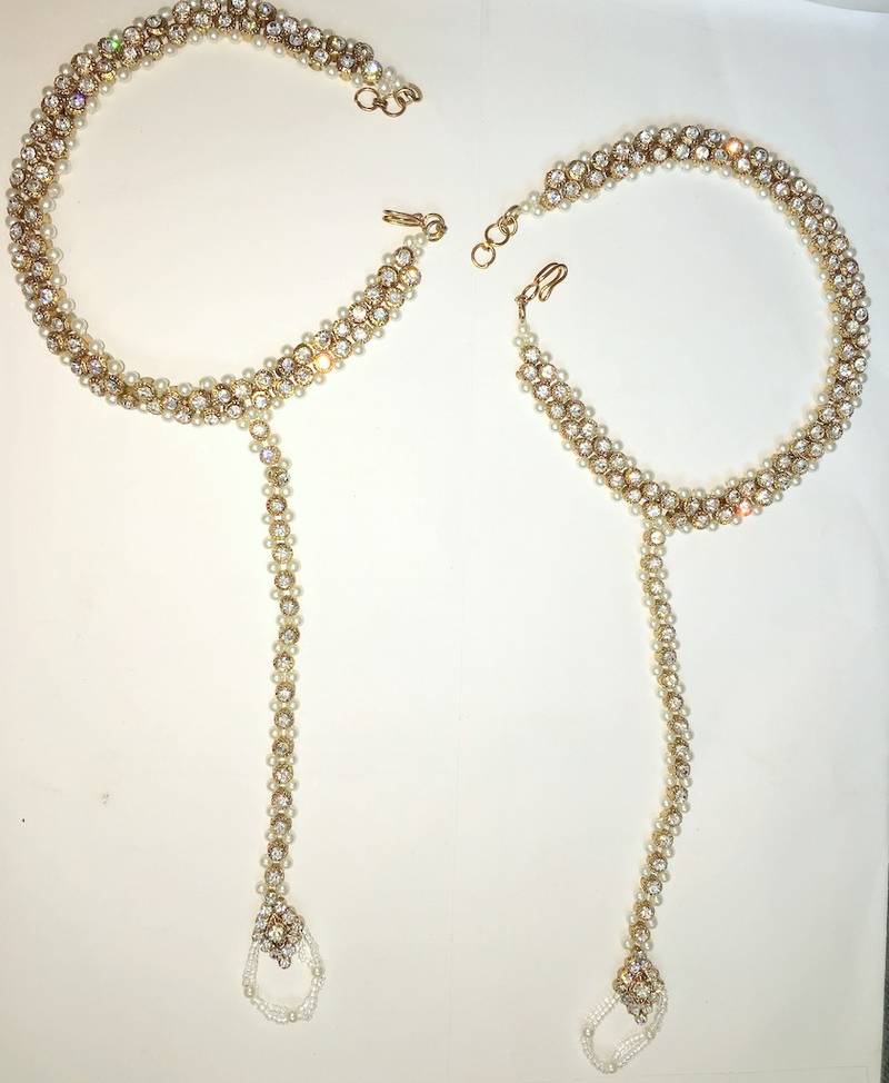 Gold tone crystal pearl anklets payal pair with toe ring attached