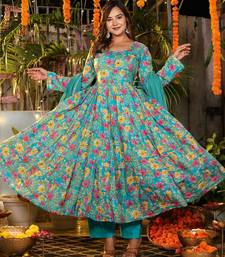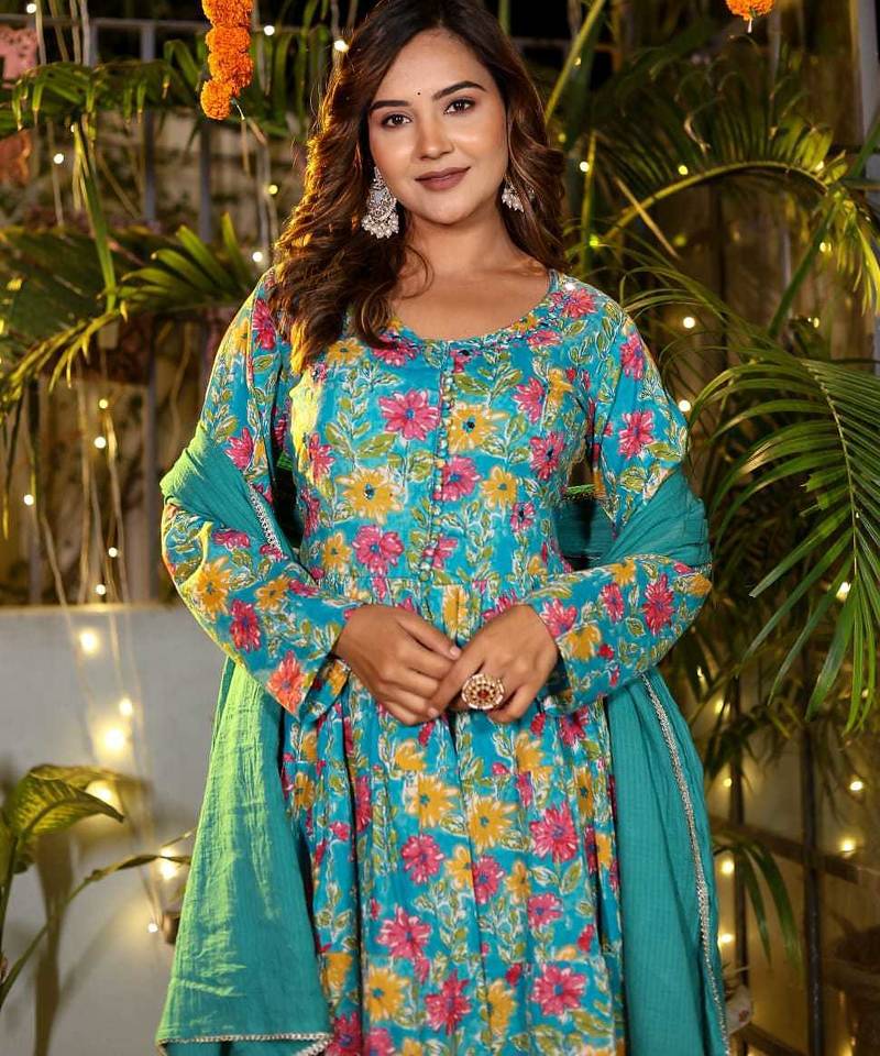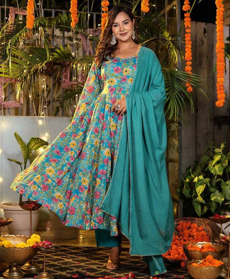 Cotton mulmul full-flare anarkali kurti-pant-dupatta set