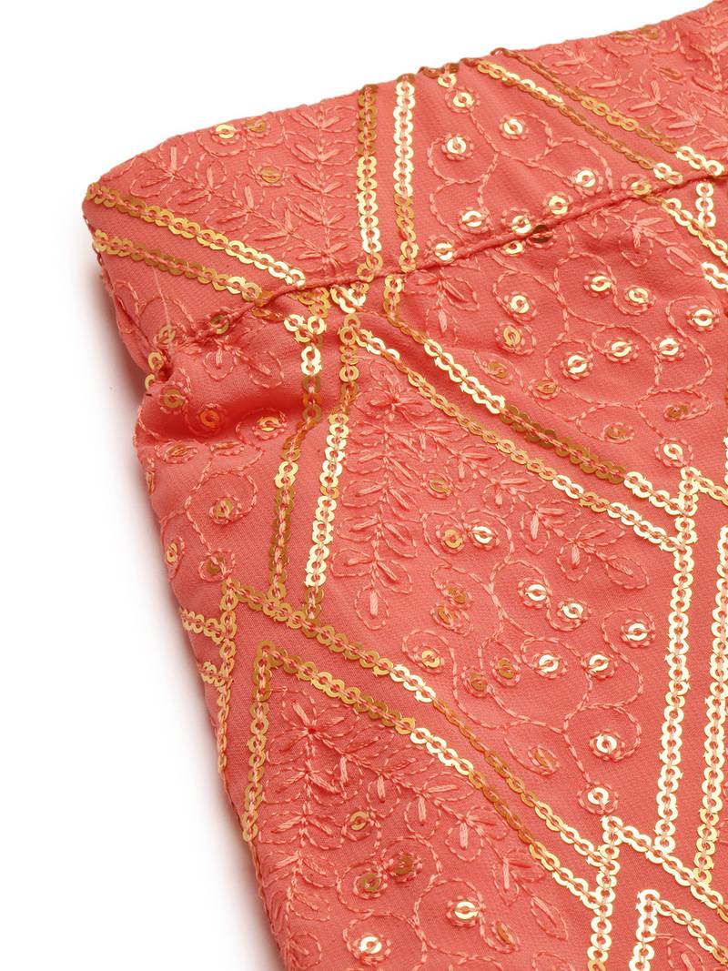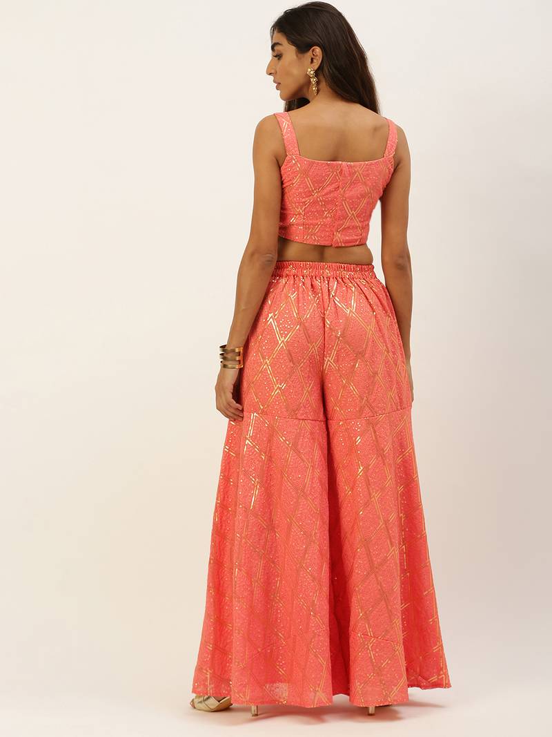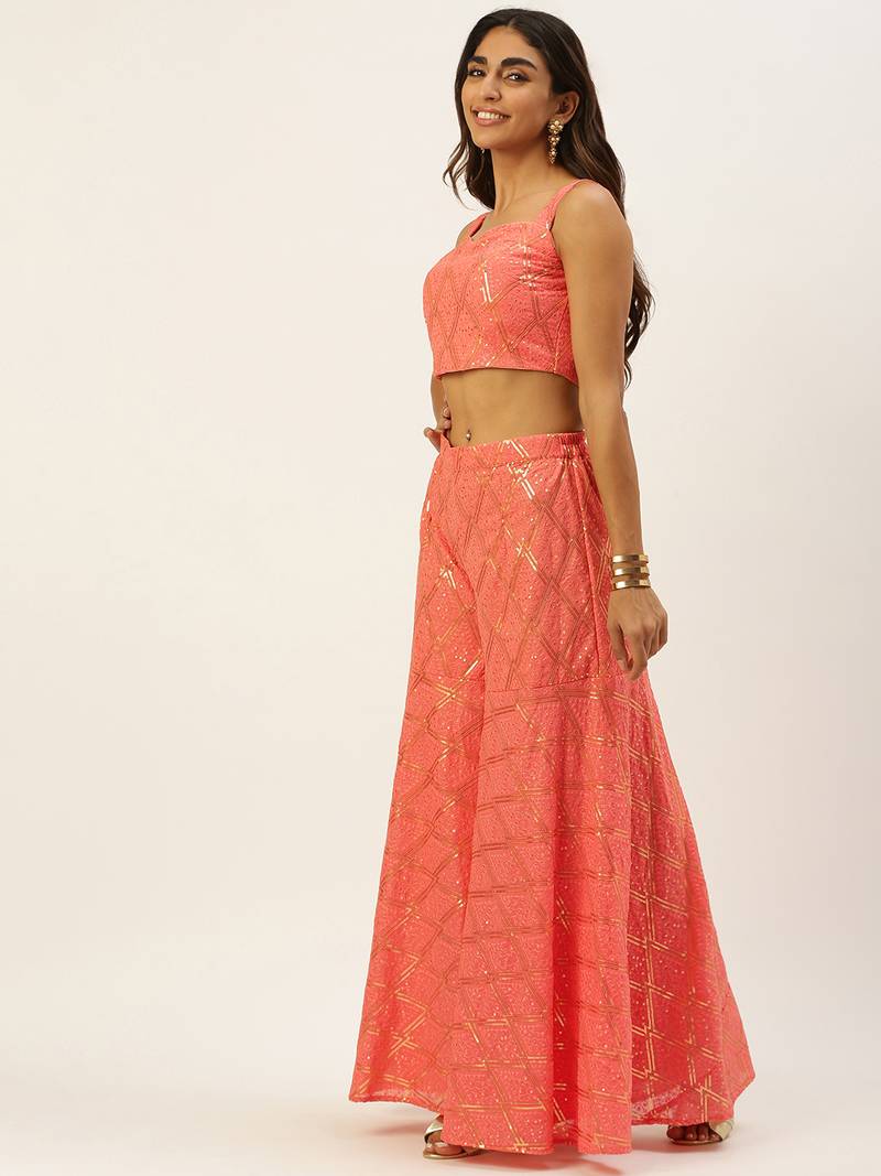 | Product Name | Ethno Vog Ready To Wear Peach Georgette Embroidered Crop Top N Gharara Set | |