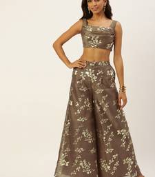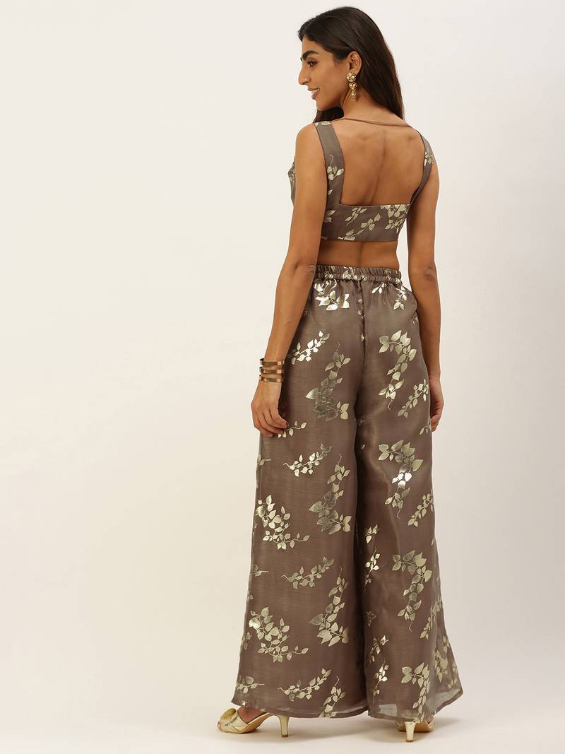 | Product Description | Presenting A Beige Foil Printed Organza Co Ords Set, Featuring Normal Neck With Cowl At The Front And Low Square Neck At The Back With Shoulder Strap, Sleeveless, Length Till Underbust, Side Zip As The Opening. It Is Paired With A Full Flare A Line Palazzo Pant Till Ankle Length And Band With Elastic Waistband. |