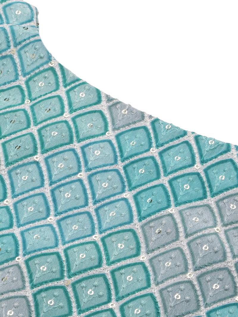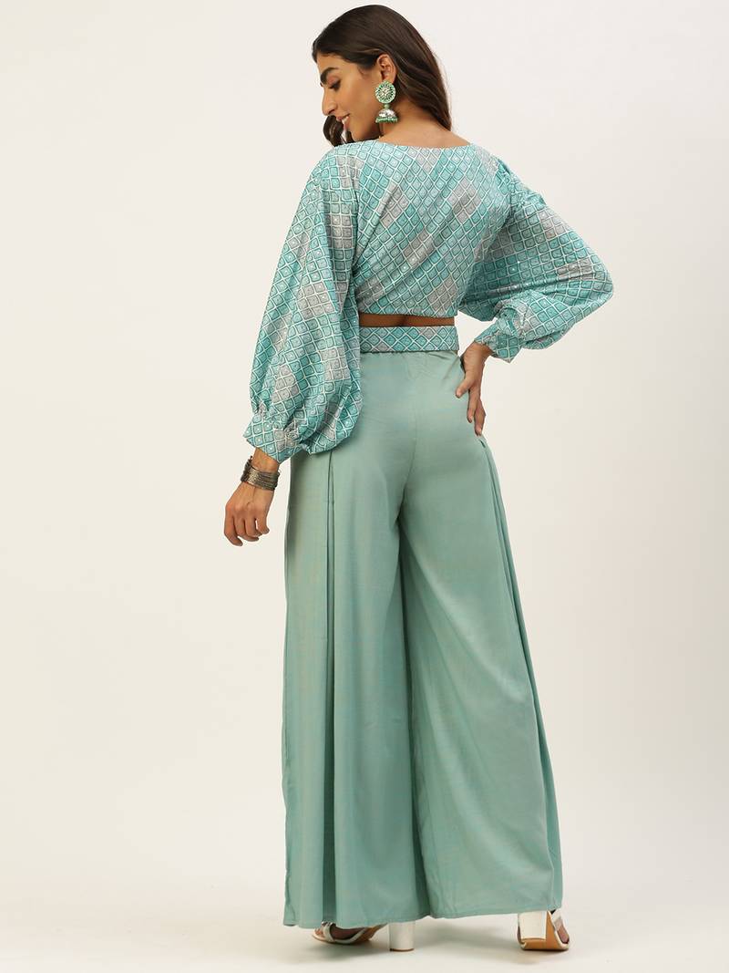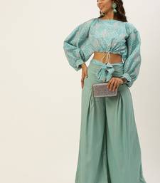 | Product Description | Presenting Muticolored Embroidered Crop And Palazzo, Features A Multicolored Chinon Kaftaan Style Crop Top Till Natural Waist, Front And Back High Neck, Full Sleeve With Cuff, Crop Top Hem Tie Up With Drawstring. It's Paired Up With Blue Naylon Floor Length Palazzo, Waist Band Type Band With Elastic, Embllished Muticolored Embroidered Tieup Detachble Belt. |