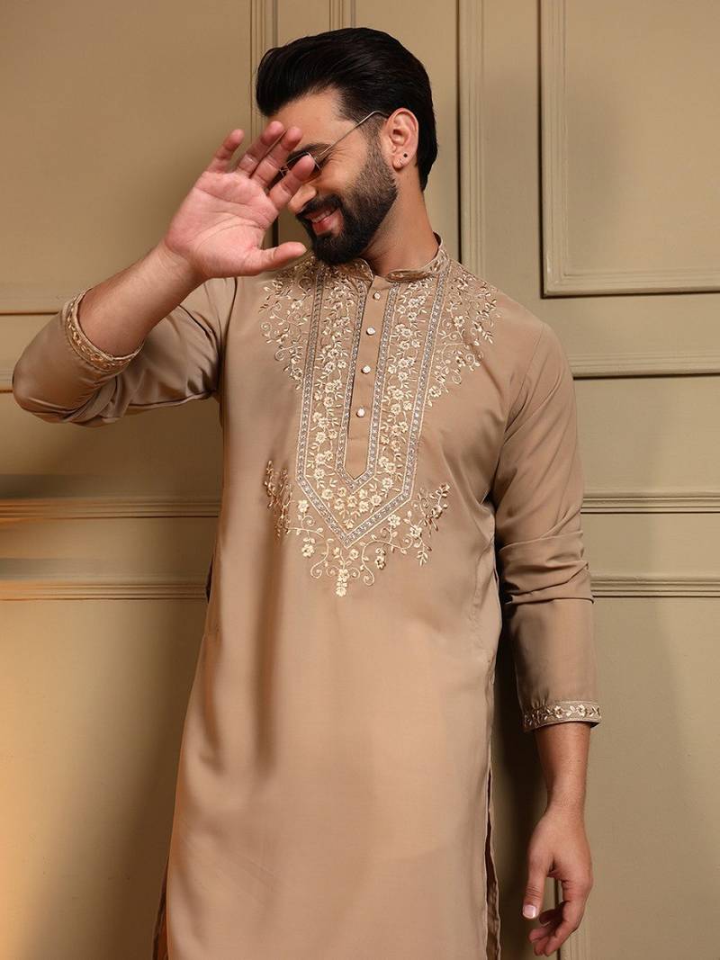 Beige silk blend embroidered work kurta payjama wedding & festive wear