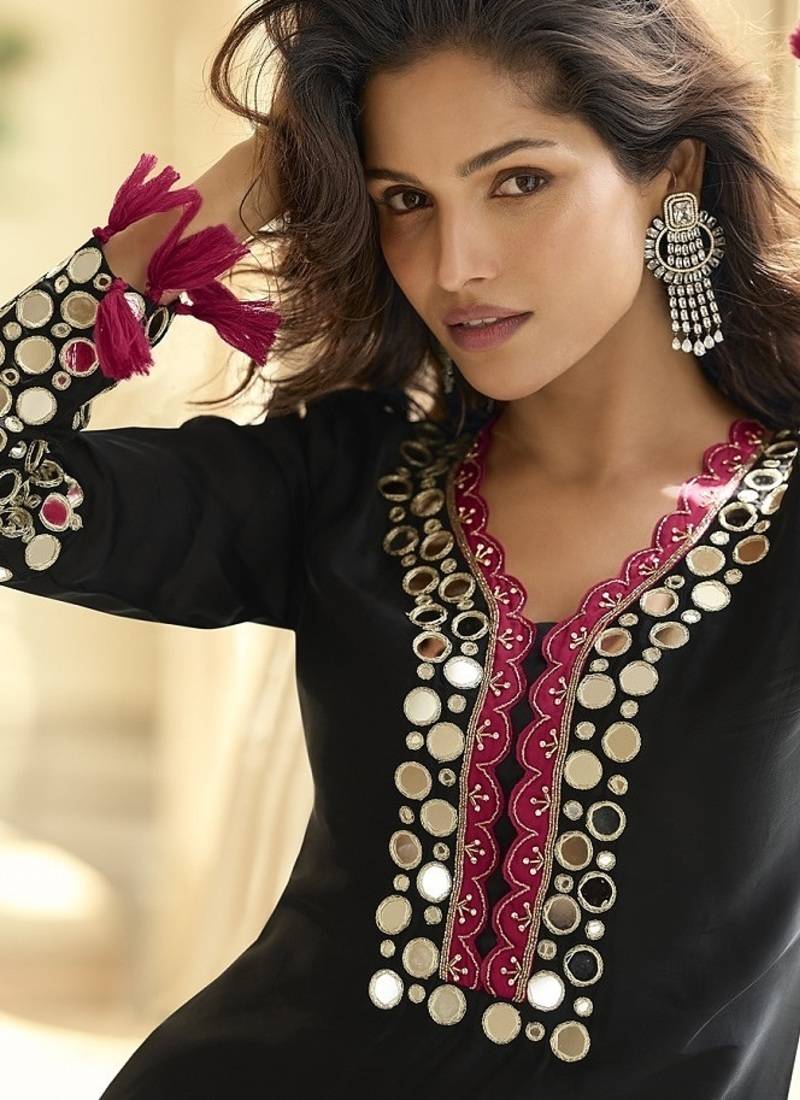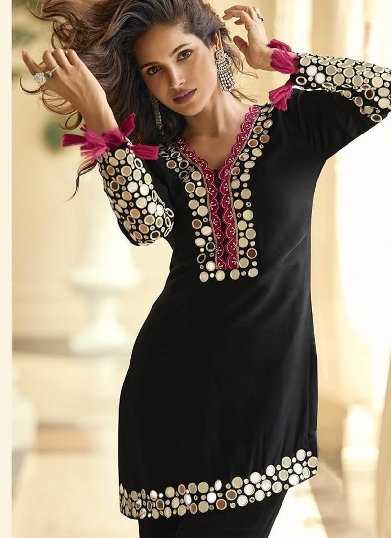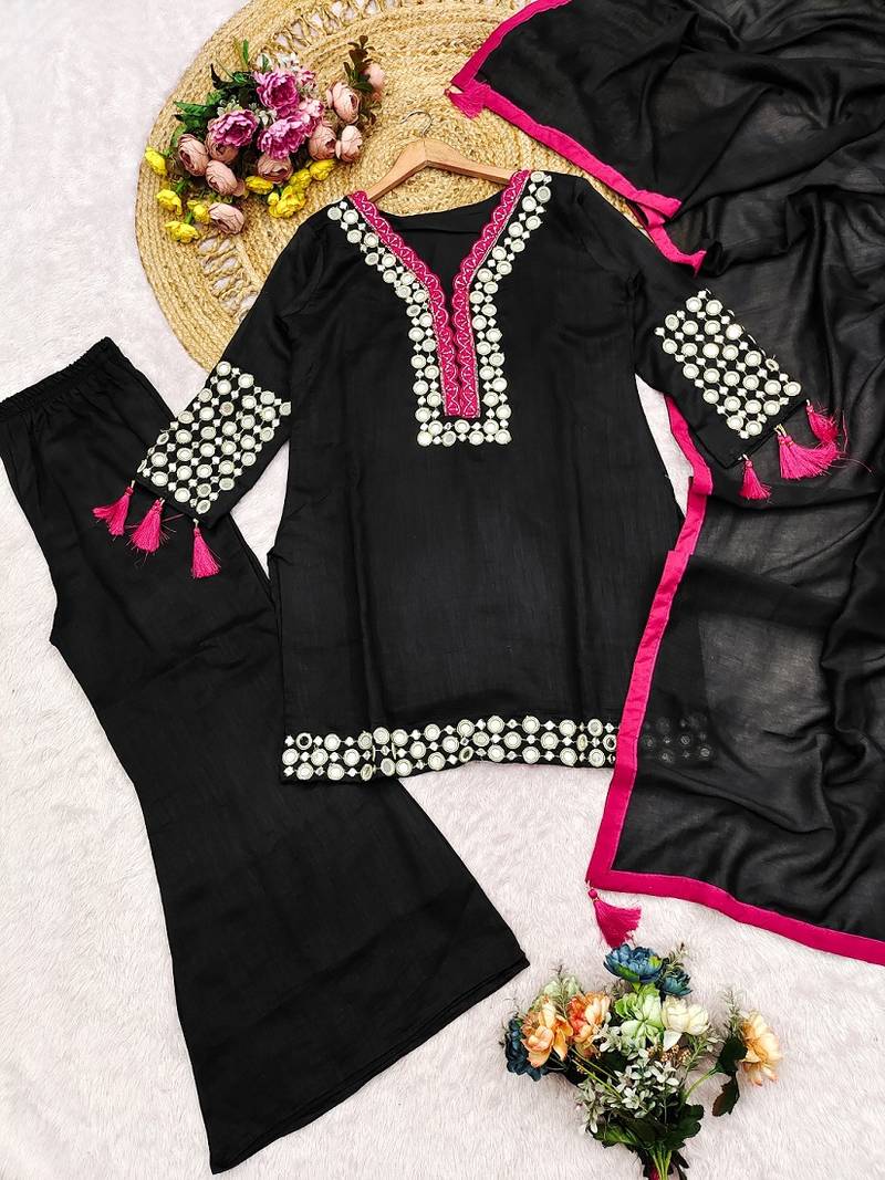 | Product Name | Black Silk Blend Mirror Embroidered Work Kurti Bootcut Bottom Set With Dupatta | |