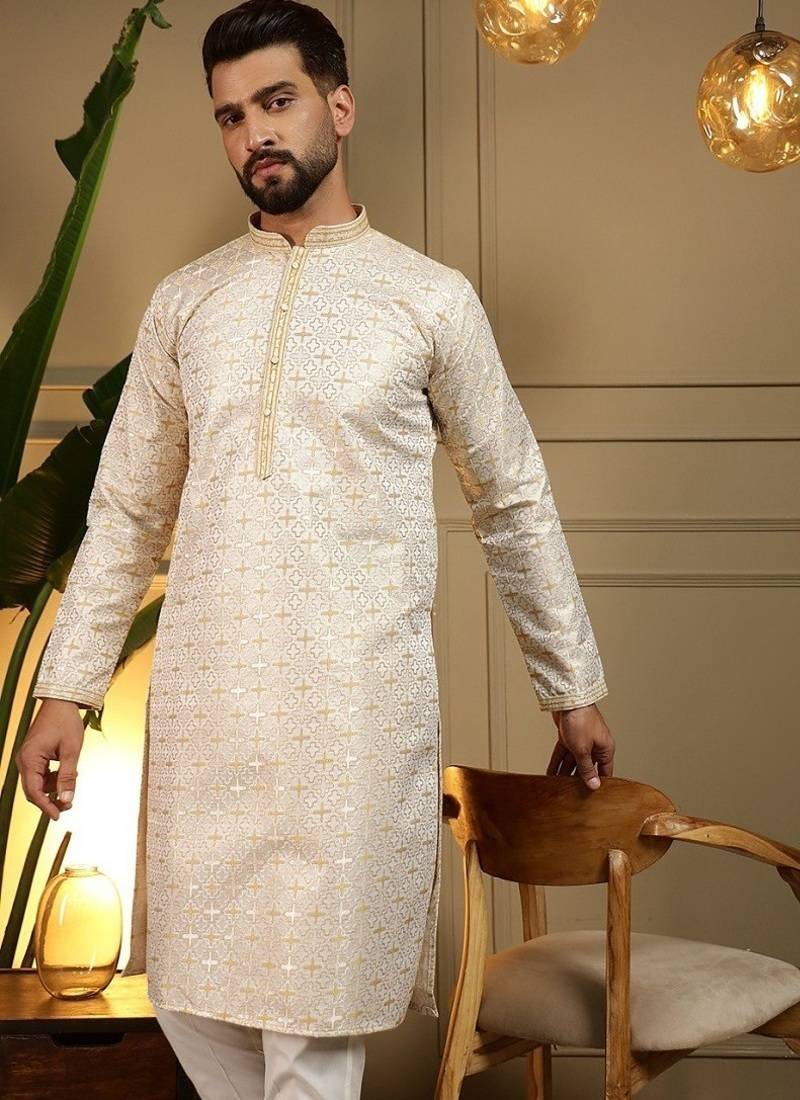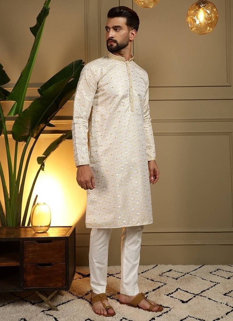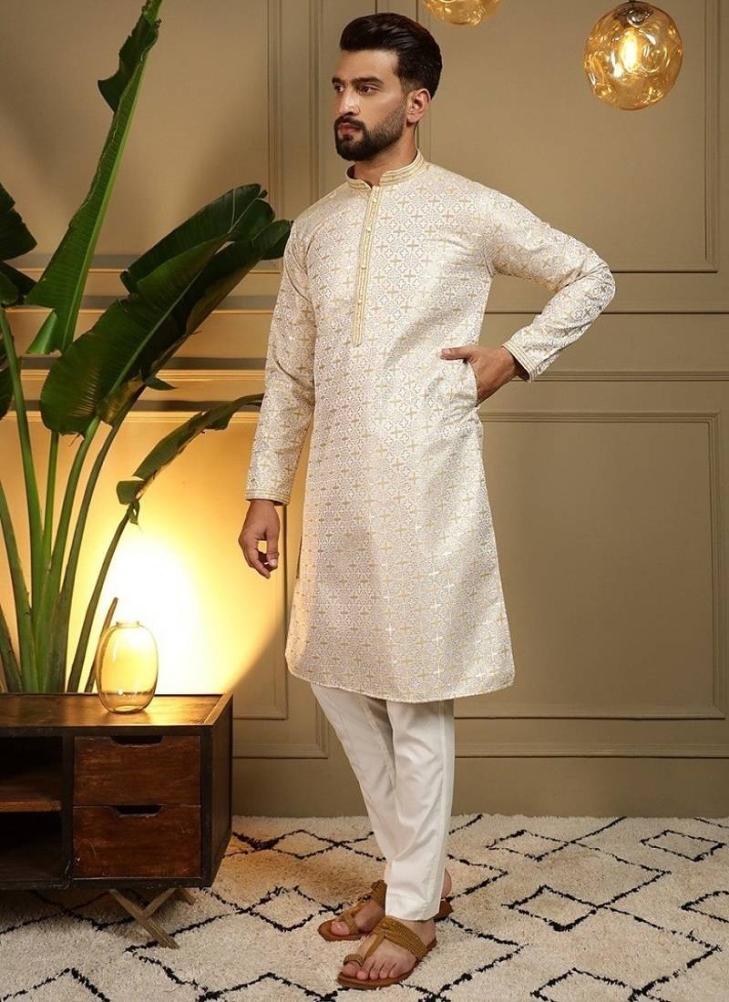 | Product Description | Elevate Your Ethnic Wardrobe With This Sophisticated Offwhite Kurta Set, Designed To Bring Timeless Elegance To Your Festive And Wedding Looks. Crafted From Premium Heavy Jacquard Fabric, The Kurta Features An Intricate Woven Pattern That Adds Depth And A Luxurious Finish To The Outfit. The Kurta Is Tailored In A Straight Knee Length Silhouette With A Mandarin Collar And A Stylish Embroidered Placket, Offering A Perfect Blend Of Tradition And Modern Style. Paired With A Comfortable Semi Cotton Churidar, This Ensemble Ensures Both Style And Ease For Long Occasions. Ideal For Weddings, Festive Celebrations, And Special Gatherings, This Kurta Set Is A Must Have For A Refined And Graceful Appearance. |