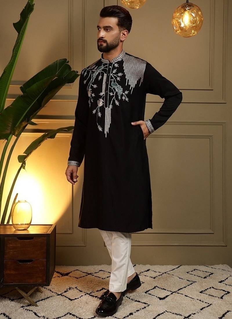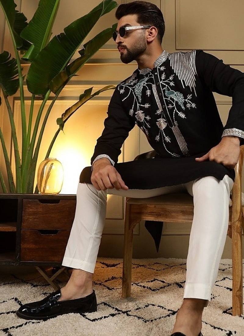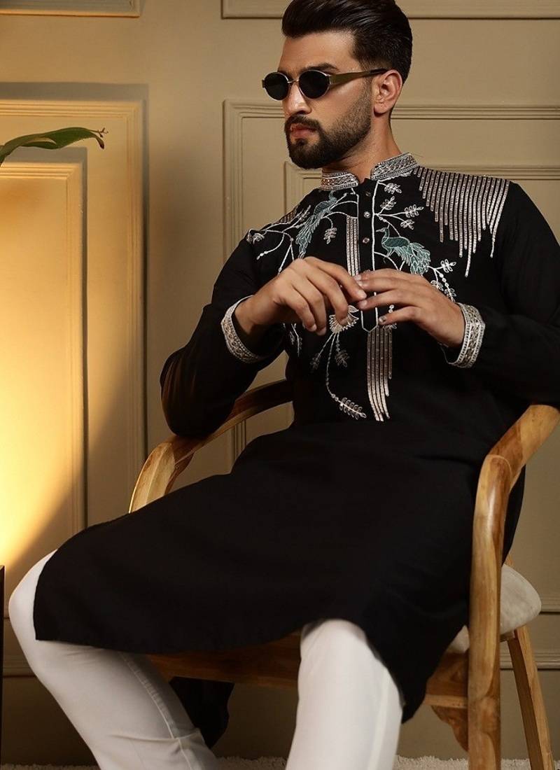 | Product Description | Elevate Your Ethnic Wardrobe With This Elegant Black Kurta Set, Crafted For Festive And Wedding Occasions. Made From Viscose Silk Fabric, This Kurta Features Elegant Sequin Embroidery On The Concealed Placket, Delivering A Sophisticated And Understated Festive Look. Designed With A Mandarin Collar, Straight Knee Length Cut , It Ensures Both Style And Comfort. Crafted With Premium Fabric, This Outfit Features Intricate Embroidery On The Neckline And Chest, Adding A Touch Of Royal Charm. Perfect For Festive Occasions, Weddings, And Cultural Celebrations, This Ensemble Blends Traditional Craftsmanship With Modern Style. A Kurta That Pairs Effortlessly With Churidars Or Pyjamas, Perfect For Modern Festive Dressing. Style Tip: