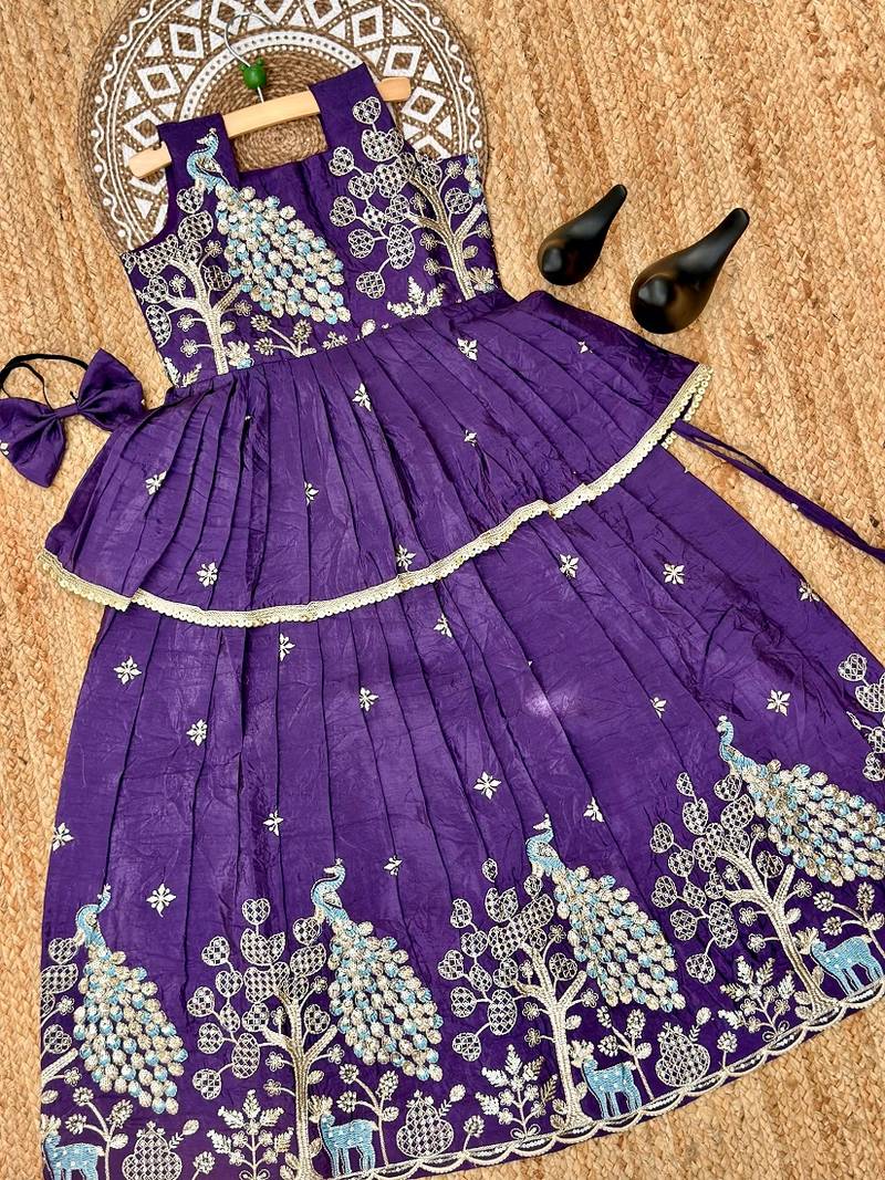 | Product Description | Elegant Purple Embroidered Lehenga Choli For Girls Make Your Little One Shine With Grace And Charm In This Beautifully Crafted Purple Lehenga Choli. Designed With Premium Gold Crush Fabric, Both The Kediya (Top) And Lehenga Offer A Rich Texture And Luxurious Appeal, Perfect For Festive Occasions And Celebrations. The Outfit Is Adorned With Intricate Embroidered Sequence Work That Adds A Touch Of Sparkle And Sophistication. The Detailed Motifs, Inspired By Traditional Artistry, Enhance The Overall Elegance While Maintaining A Playful Charm Suitable For Young Girls. The Flared Lehenga Provides A Voluminous And Comfortable Fit, Allowing Ease Of Movement, While The Sleeveless Kediya Ensures A Stylish And Modern Look. The Vibrant Purple Hue Combined With Golden Embroidery Creates A Striking Contrast, Making It An Ideal Choice For Weddings, Festivals, And Special Events. |