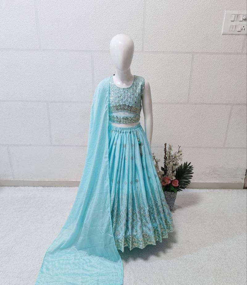 Skyblue chinon silk embroidered work wedding kids lehenga choli