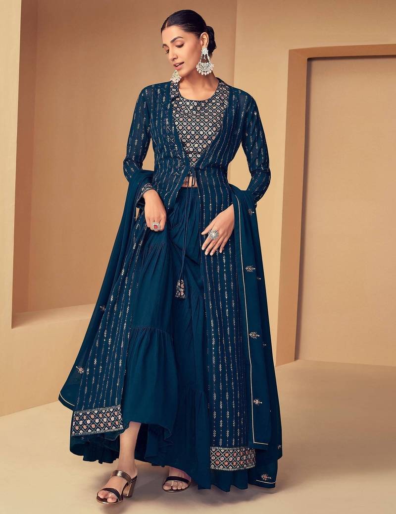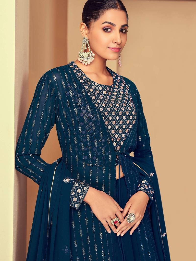 Product Description | Premium Material Crafted From High Quality Georgette Fabric With Intricate Sequin Embroidery Work, Perfect For Special Occasions. Complete Set Includes Lehenga (Skirt), Choli (Blouse), Dupatta (Scarf), And A Stylish Shrug For Versatile Styling Options. Design Elements Beautiful Turquoise Colour Adorned With Detailed Embroidery And Sequin Work That Adds Sparkle And Elegance. Occasion Wear Ideal For Festive Celebrations, Wedding Functions, Party Wear, And Traditional Ethnic Ceremonies. Style Features Contemporary Fusion Design Combining Traditional Lehenga With Modern Shrug, Suitable For Various Formal Occasions. |