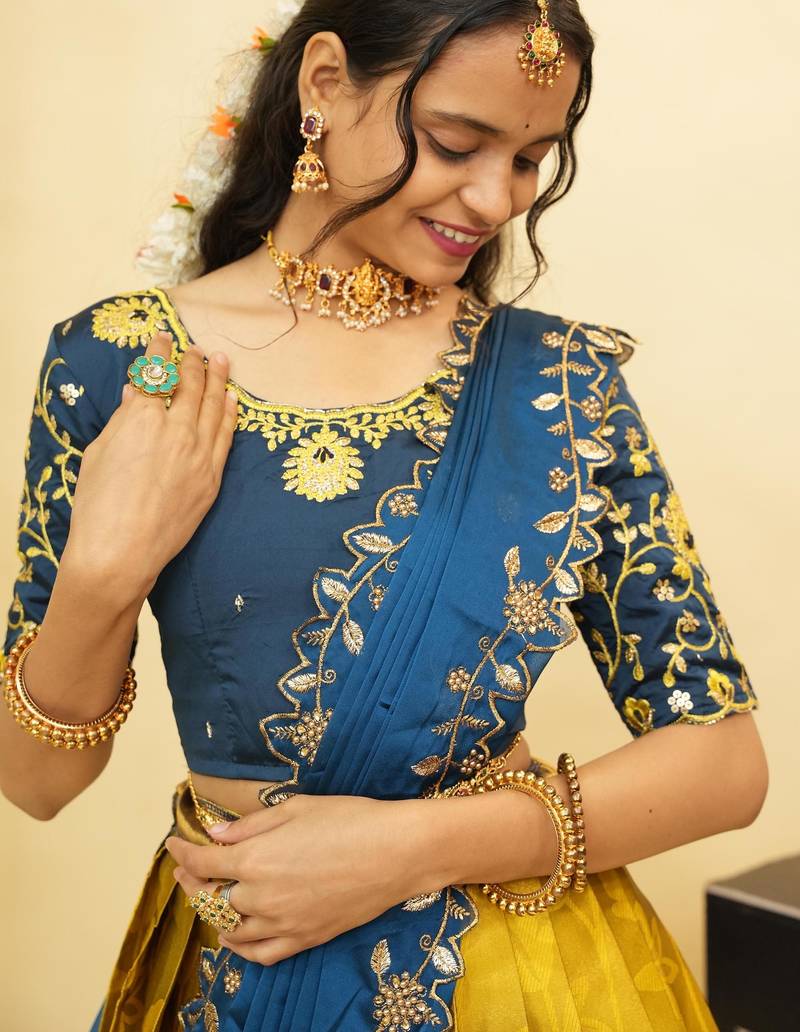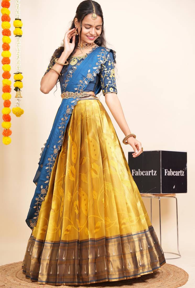 Product Name Beautiful South Indian Style Semi Stitched Half Saree With Blouse And Dupatta For Women