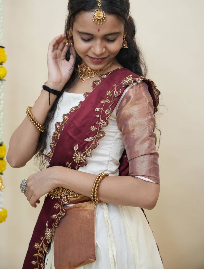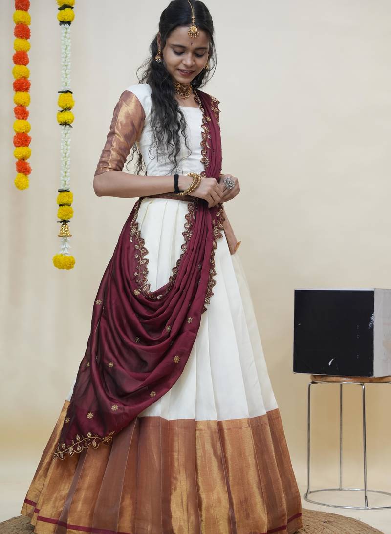 Beautiful south indian style semi-stitched half saree with blouse and rangoli dupatta for women