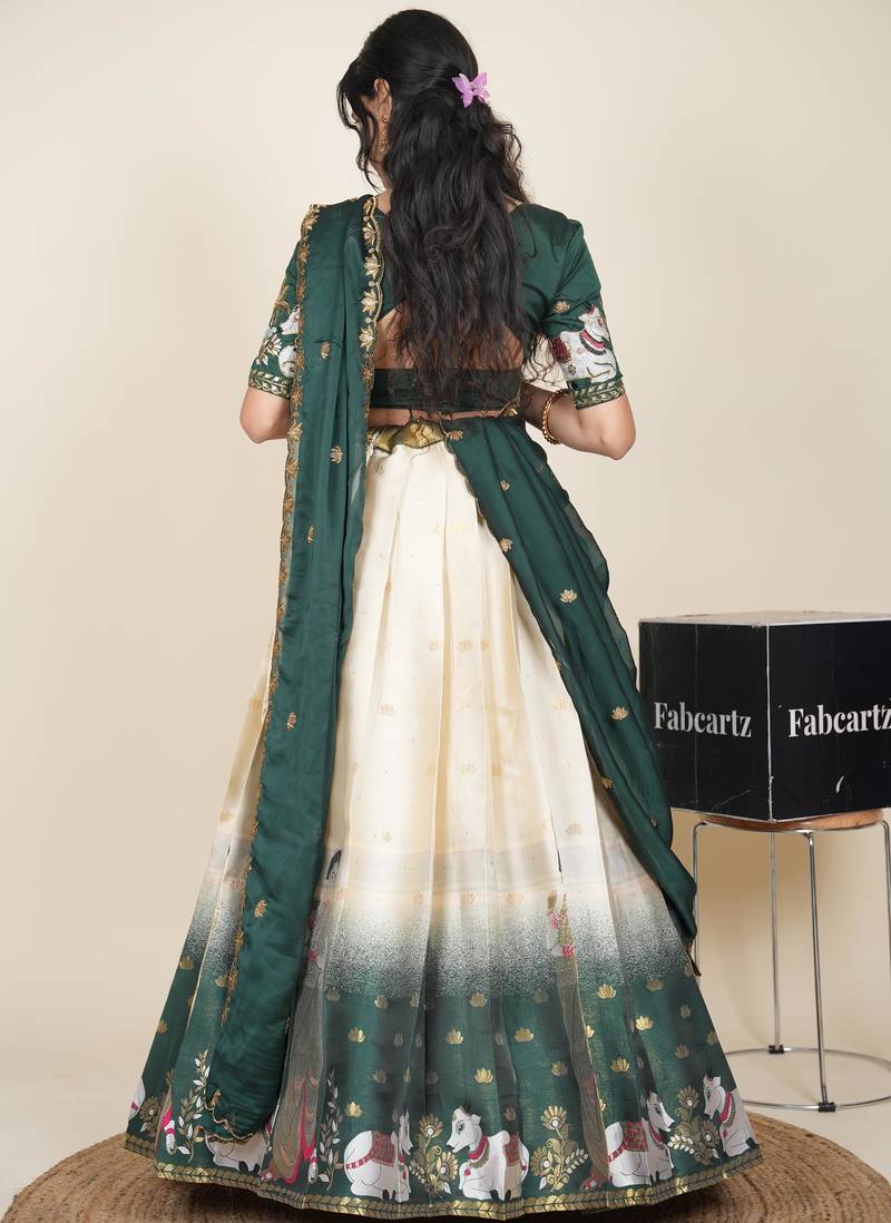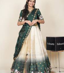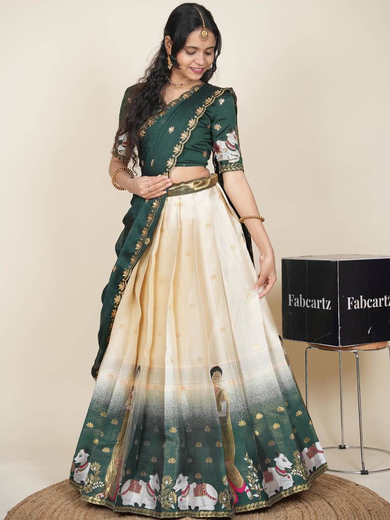 Beautiful south indian style semi-stitched half saree with embroidered blouse and rangoli dupatta for women