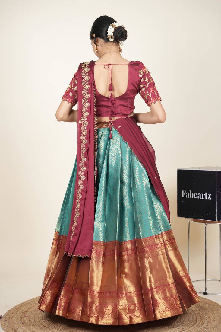 | Product Name | Beautiful South Indian Style Semi Stitched Half Saree With Embroidered Blouse And Rangoli Dupatta For Women | |