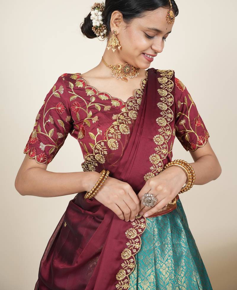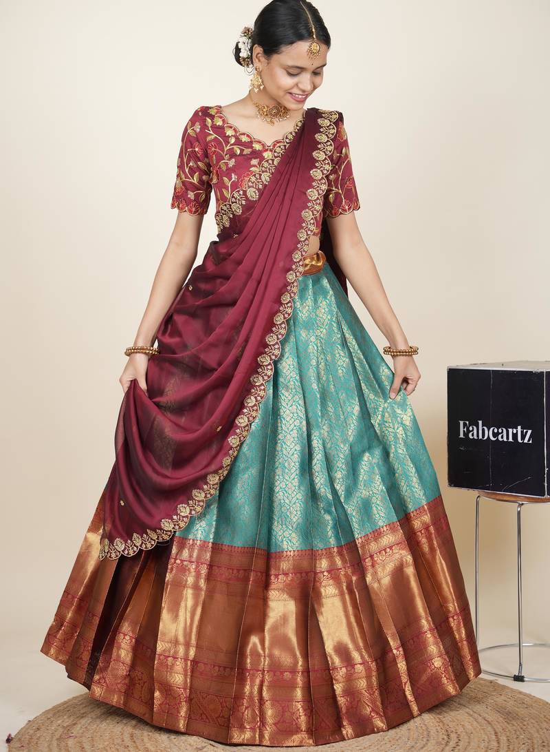 Beautiful south indian style semi-stitched half saree with embroidered blouse and rangoli dupatta for women
